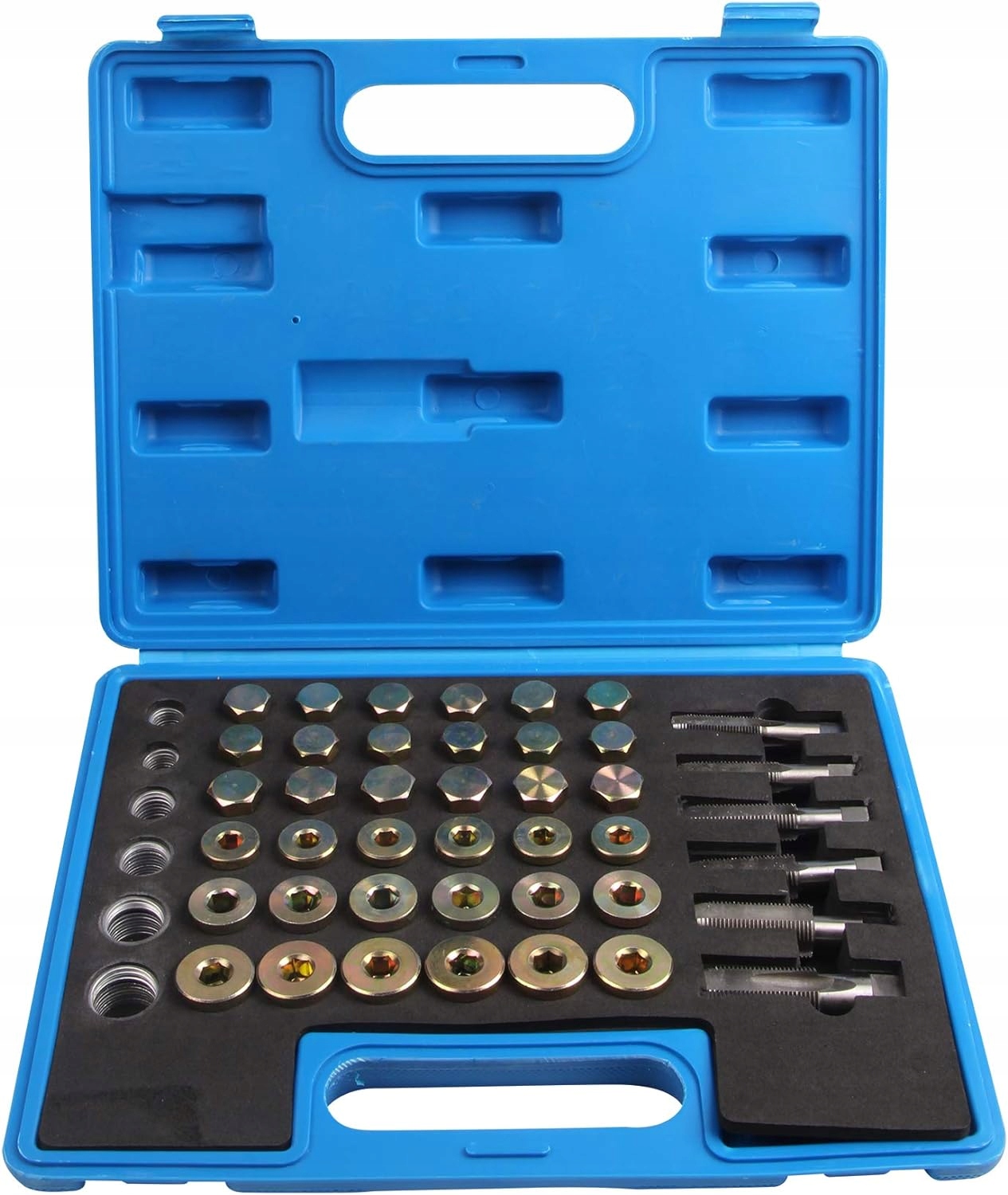 Набір кранів і пробок для простого ремонту різьби масляного піддона, коробки передач та інших зливних пробок. Підходить до більшості різьб, які зазвичай використовуються в легкових автомобілях і легких вантажівках. Набір призначений для автомайстерень, ремонтних майстерень і сервісів.