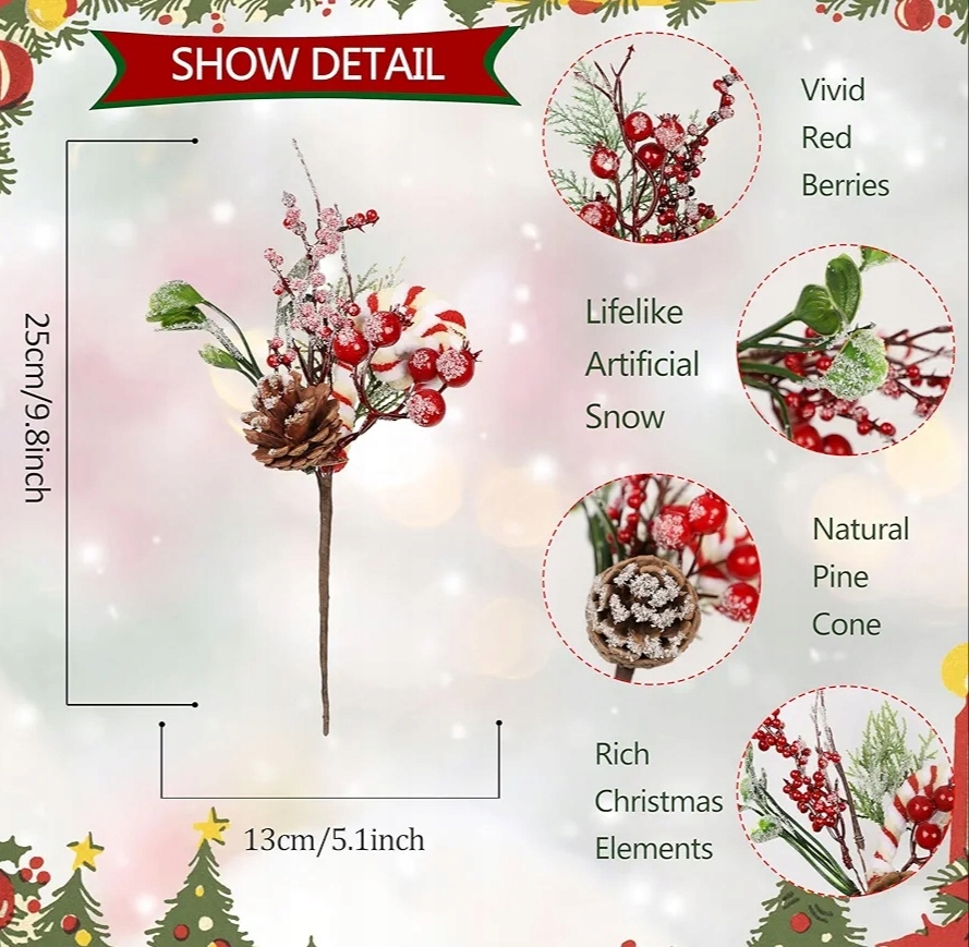 - Ці різдвяні штучні кирки виготовлені з високоякісної пластикової суміші з гнучким дротом як ніжкою. Реалістичний різдвяний колір поєднується з морозною поверхнею, завдяки чому ці гілки соснових шишок виглядають справжніми.