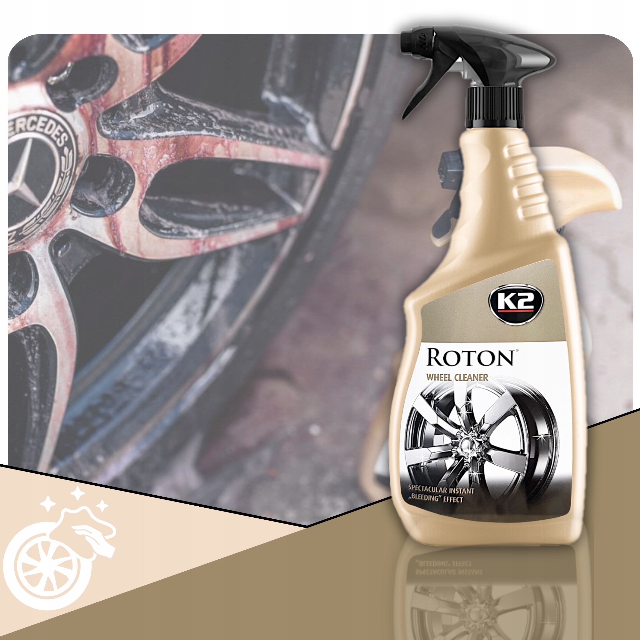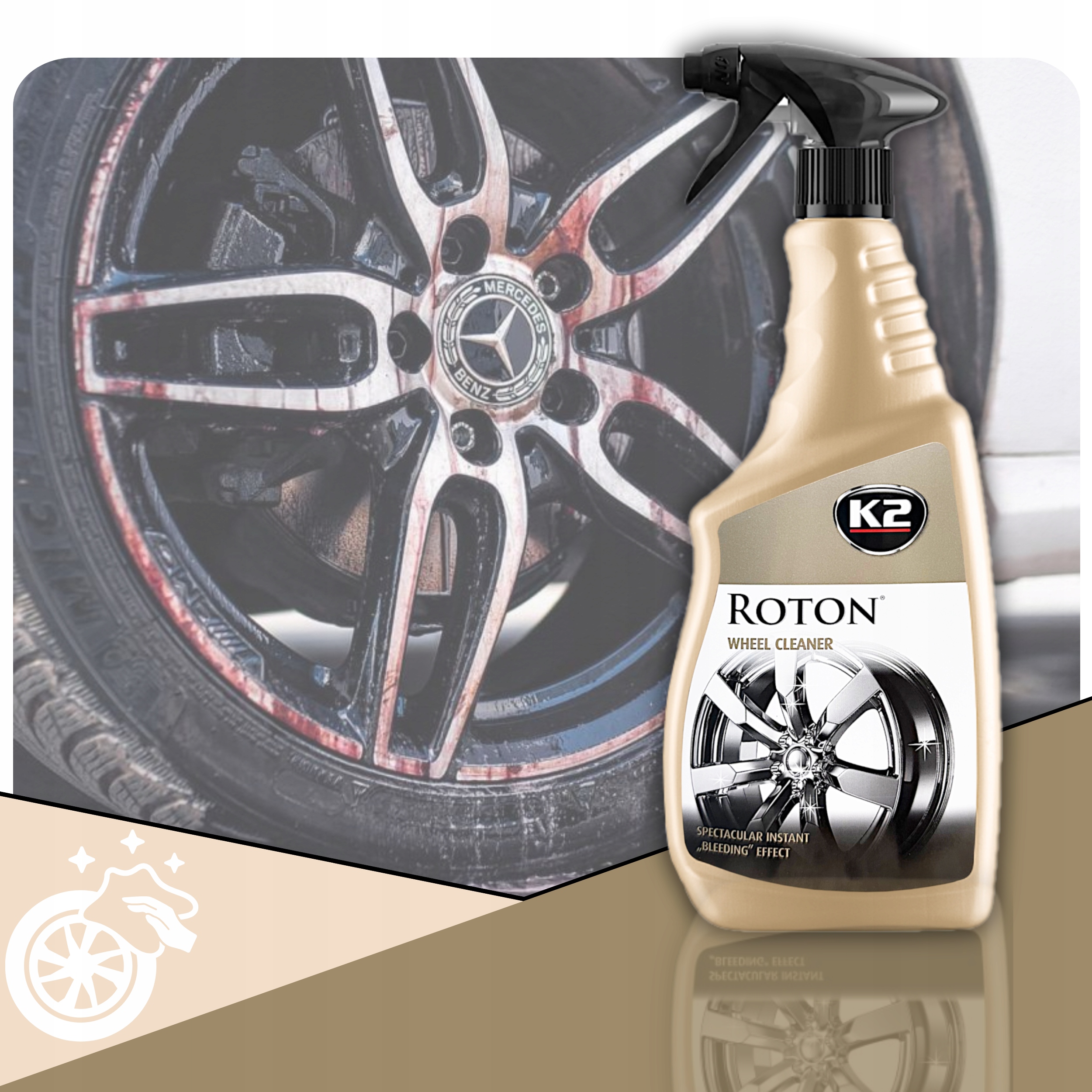 K2 ROTON ефектно видаляє всі стійкі забруднення, включно з відкладеннями на гальмівних колодках і дорожнім брудом, в результаті чого нанесена рідина забарвлюється в червоний колір.