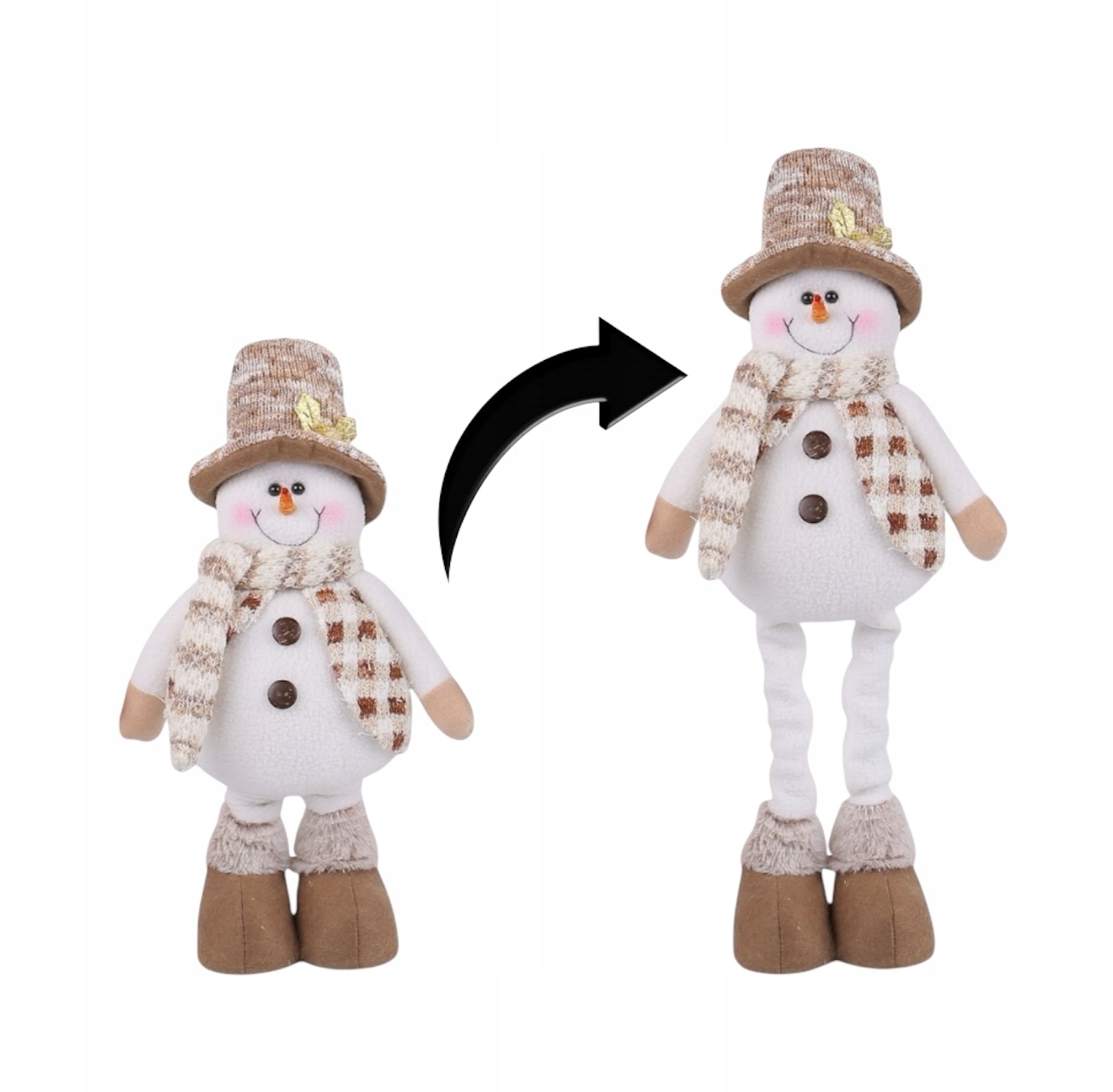 Цей чарівний сніговик, висота якого регулюється до 50 см, стане ідеальною прикрасою в сільському стилі! Завдяки в’язаній шапочці з декоративним листочком, картатим шарфом і еластичними ніжками він створить затишну різдвяну атмосферу вдома чи в саду. Виготовлений з м'якого, міцного плюшу, він порадує дітей та гостей!