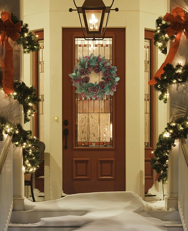 Унікальний дизайн: кедровий вінок прикрашений яскраво-червоними ягодами, які символізують достаток і тепло. Додавання натуральних ялинових шишок надає вашому зовнішньому різдвяному вінку сільський відтінок, який поєднує природну красу та святковий настрій. Різдвяний дверний вінок є ідеальним символом радості та тепла різдвяної пори та поширює святковий дух.