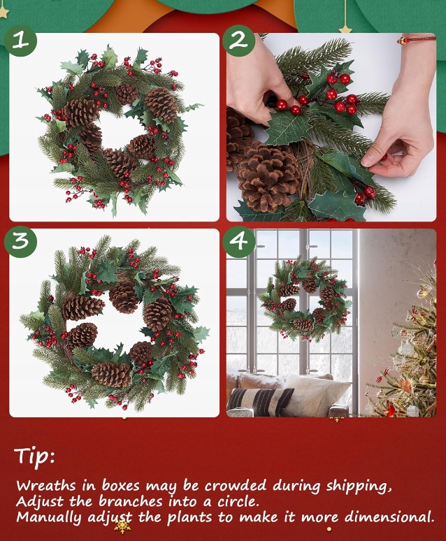 Ідеальний подарунок, який вимагає легкого формування - штучний зимовий вінок також є елегантним різдвяним подарунком. Ви можете подарувати його як ідеальний подарунок своїм близьким і друзям, висловивши своє благословення та турботу про них. Продукт може стиснутися під час транспортування. Після розпакування розправте гілки та листя, щоб надати кращої форми.
