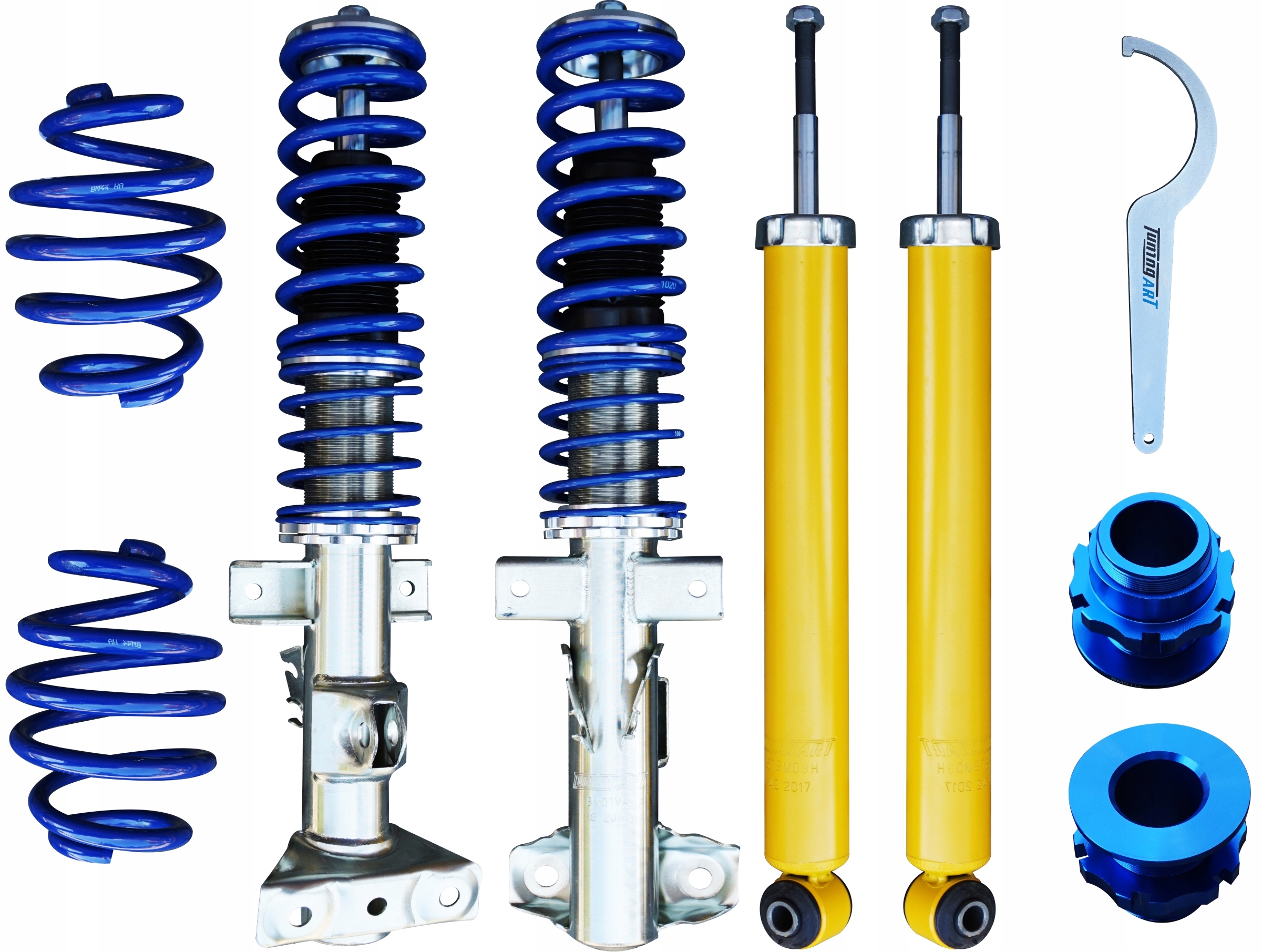 В комплекті 2 різьбових амортизатора, 4 спортивних пружини, задні амортизатори, задні регулювальні втулки , ключ регулювання висоти та сертифікат TUV