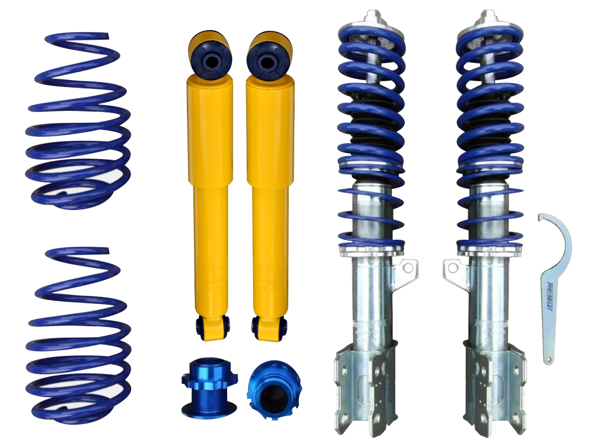В комплекті 2 різьбових амортизатора, 4 спортивних пружини, задній амортизатор амортизатори, регулювальні манжети ззаду, ключ регулювання висоти та сертифікат TUV