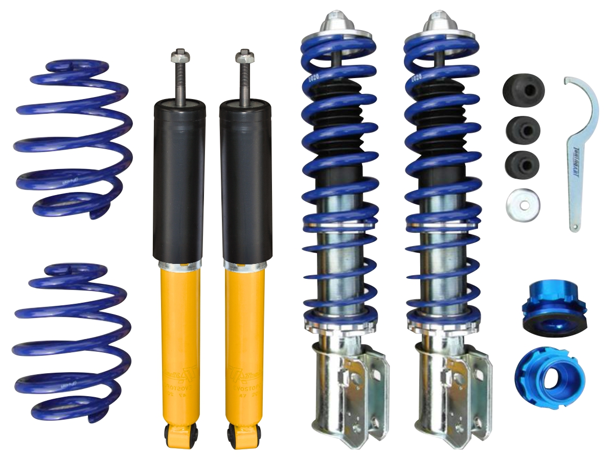 В комплекті 2 різьбових амортизатора, 4 спортивних пружини, задні амортизатори, задні регулювальні втулки, гайковий ключ для регулювання висоти та сертифікат TUV
