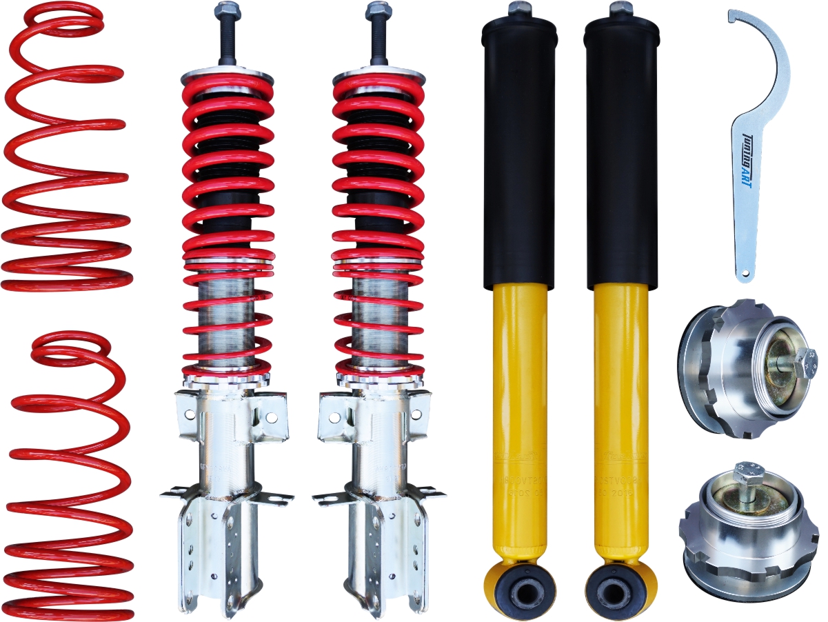 В комплекті 2 різьбових амортизатора, 4 спортивних пружини, задні амортизатори, задні регулювальні втулки, гайковий ключ для регулювання висоти та сертифікат TUV