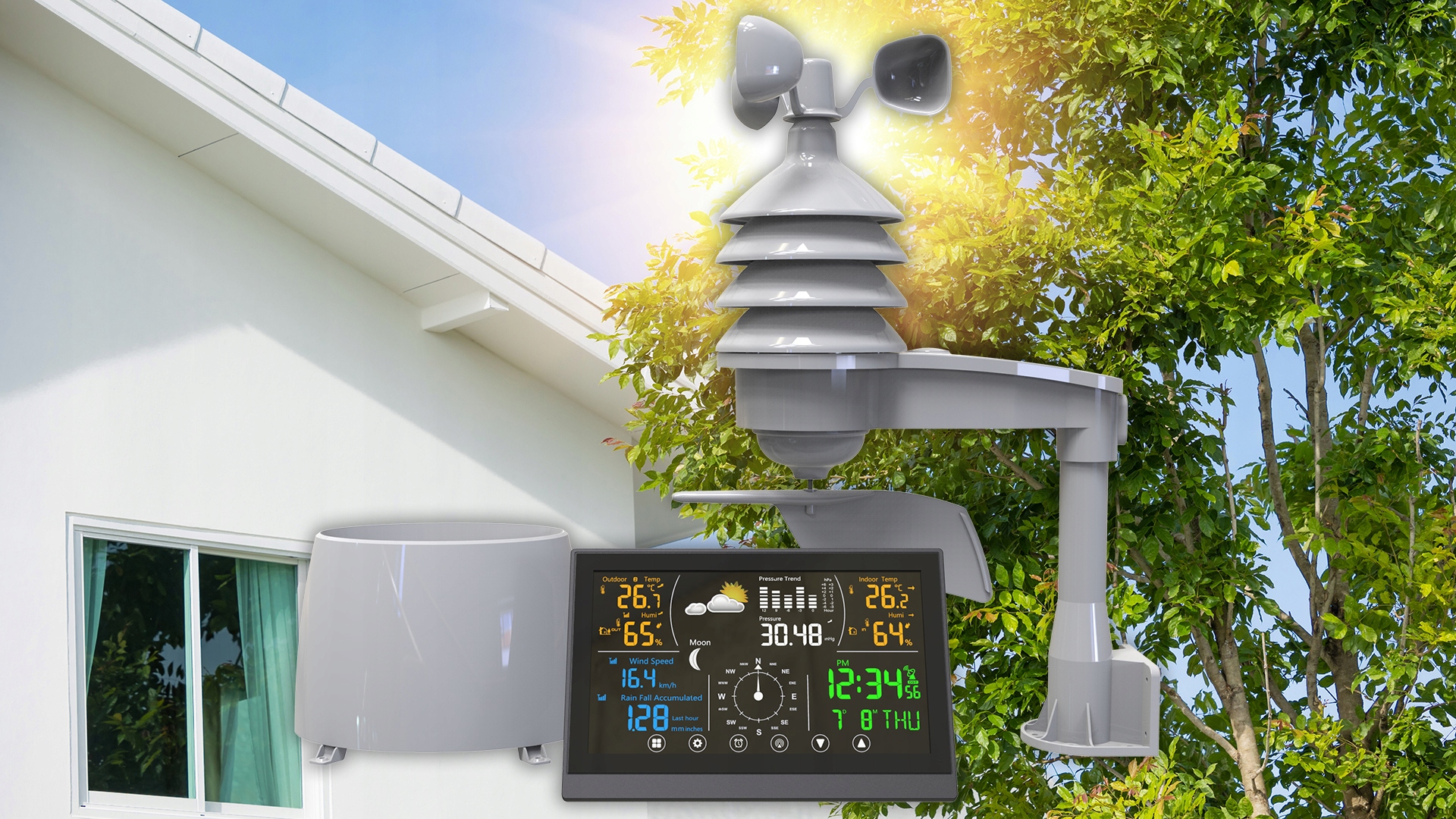 - Датчик температури, вологості та вітер: Чотири батареї типу АА (не входять в комплект)