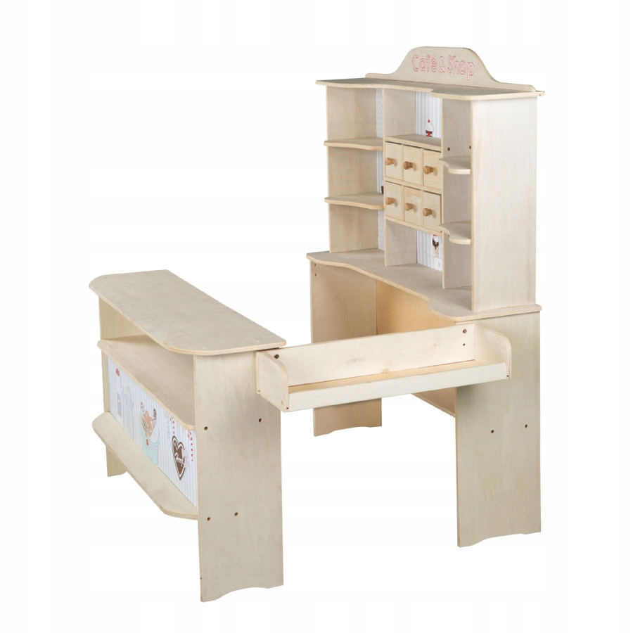 Великий дерев’яний магазин з ніжним друком - ідеальна забава. У магазині є великий дерев'яний прилавок з додатковим місцем для зберігання, бічним дерев’яним перегородкою та задньою стінкою з багатьма поличками та ящиками. Це пекарня з кафе, салоном з морозивом або екологічним магазином - магазин з дерева пропонує багато місця для уяви та творчості. Чудове місце для гри для дитини та його друзів. Окрім стендів Rob Sales, доступний багатий набір аксесуарів для магазинів. Зроблений для наймолодших.