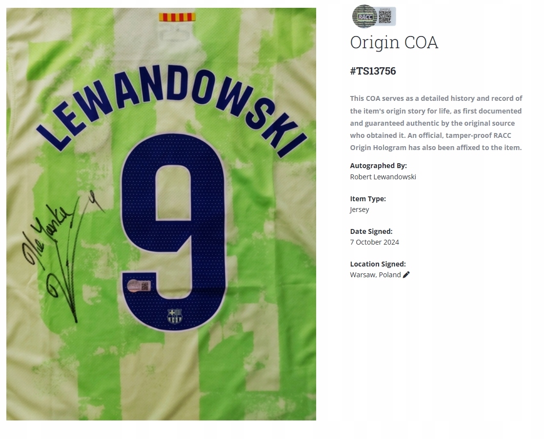 t -сорочка з оригінальним автографом Роберта Левандовського. Сертифікат автографічної автентичності, виданий авторитетною американською компанією у вигляді наклейки голограми з QR -кодом. Сканування QR -коду надсилається на сертифікат в електронній формі, яка також доступна за такою адресою: