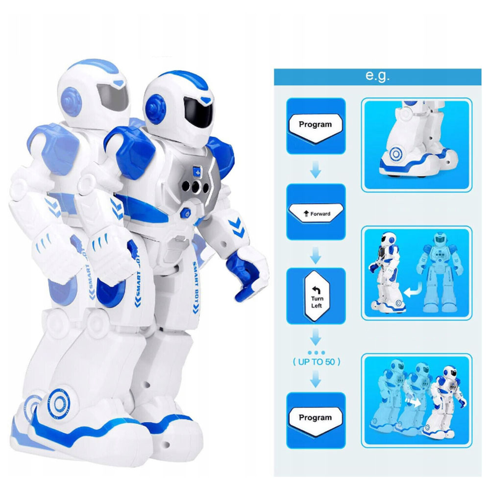 Наша розумна іграшка-робот може виконувати послідовність із 50 рухів, які ви програмуєте. Коли цей інтерактивний робот перемикається в режим програмування, він використовує функцію запису дій для відтворення налаштованої послідовності, напр. поворот ліворуч + поворот праворуч + крок вперед + крок назад + патруль + танець + інші вибрані режими роботи.