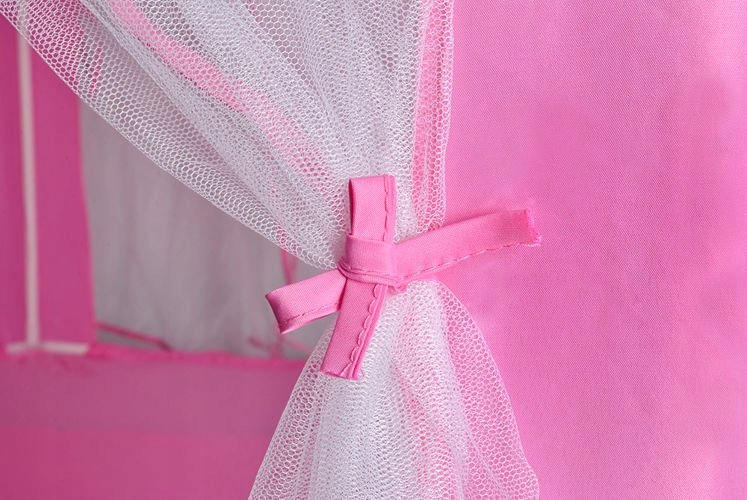 Тканинний намет - однозначно незамінний супутник під час дитячих пустощів. Має шестикутну основу, 6 вхідних отворів і дах у формі піраміди. Іграшка має привабливий зовнішній вигляд. Рожевий колір покриття та смуги додають естетичної цінності. Входи закриті напівпрозорими білими шторамиякі ідеально поєднуються з рештою намету. Гардинки можна зав'язати або задрапірувати різними способами за допомогою декоративних стрічок. Рішення, яке використовується разом з бантами, додає шарму та урізноманітнює веселощі.
