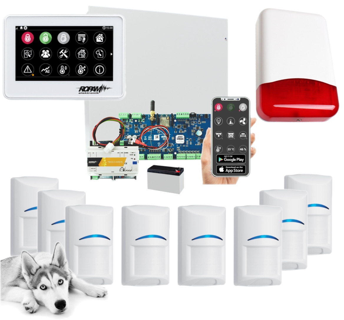 Сигналізаційна панель Ropam Neo-IP-64-SET з модулем WiFi, включно з сенсорною панеллю (білий), 8 сповіщувачами Bosch Pet 20 кг і сигнальною сиреною