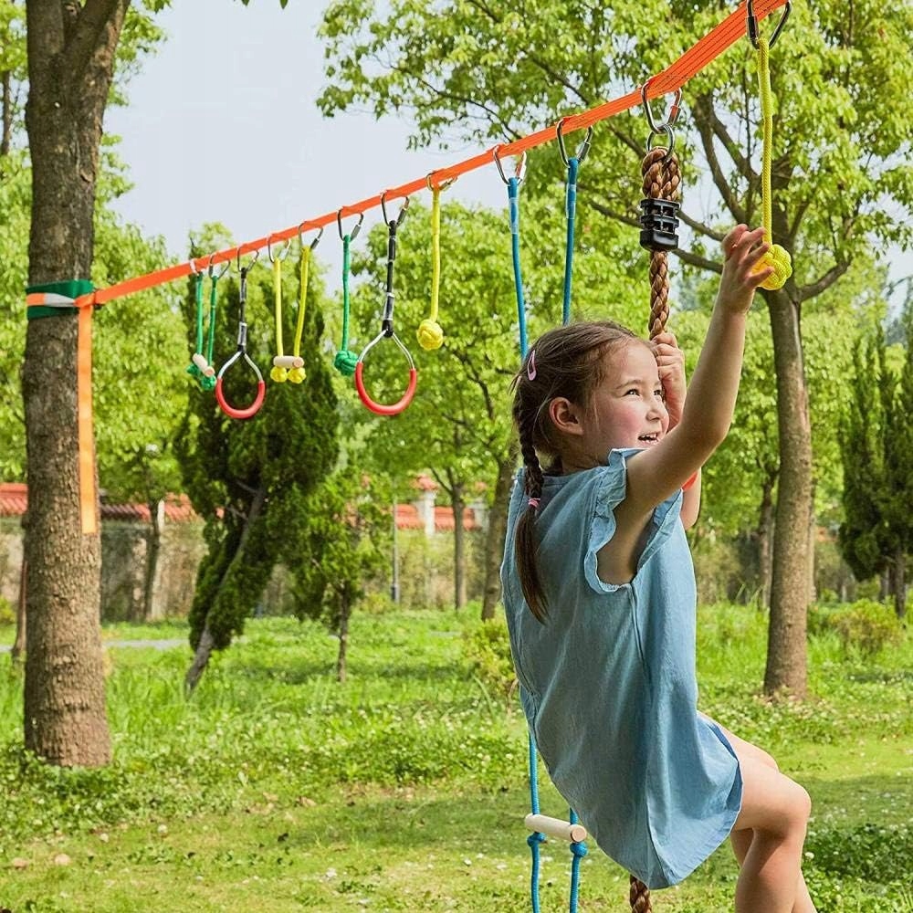 - ✅ Міцна нейлонова мотузка підвішується над землею між двома деревами або стовпами, і шматки висять будь-де на міцні сталеві карабіни.