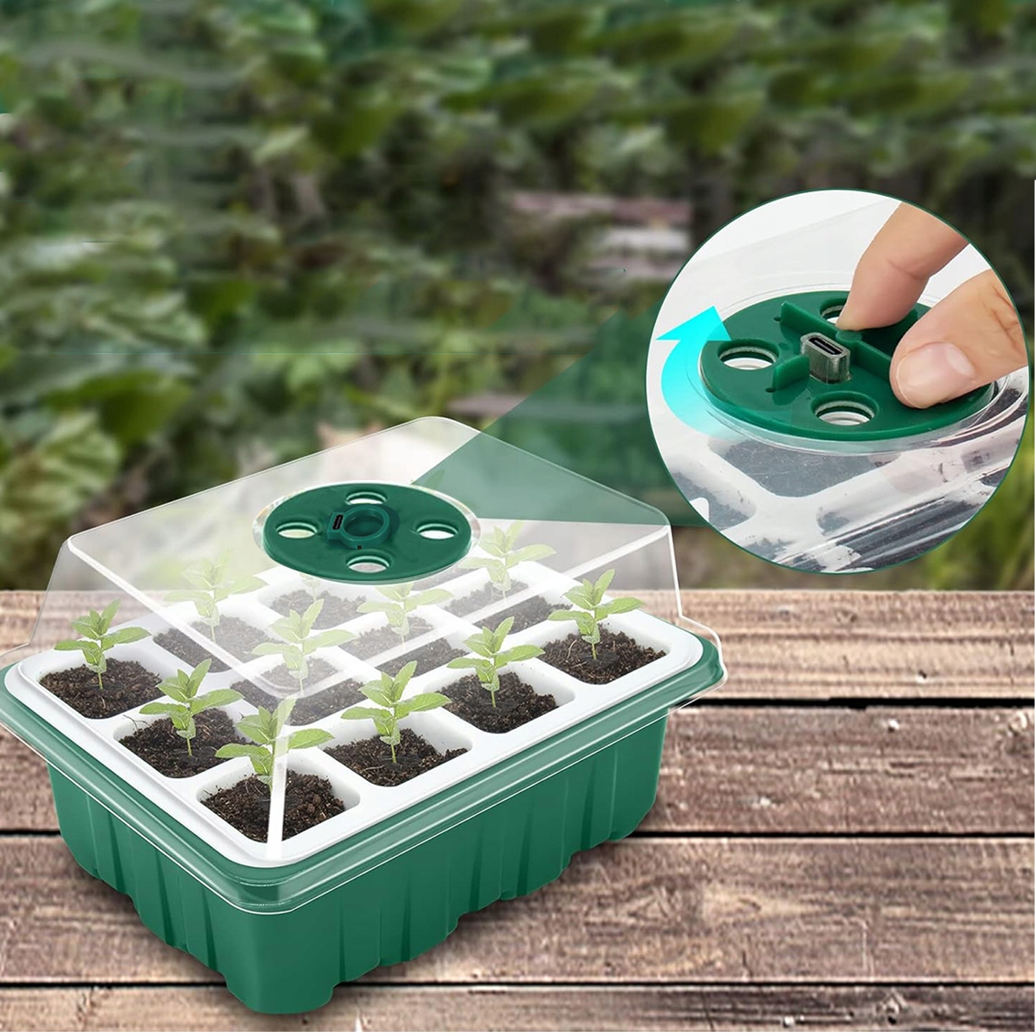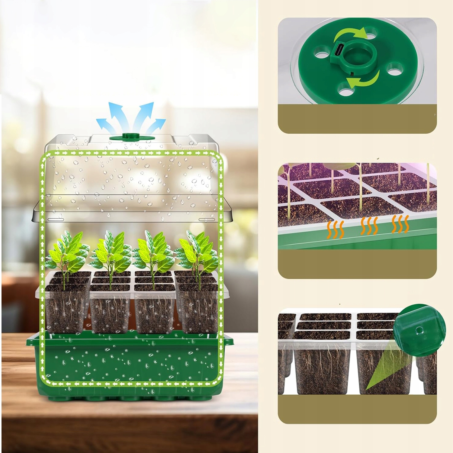 - Внутрішню вологість і температуру можна легко регулювати обертанням контролера відповідно до різних стадій росту насіння та розсади, сприяючи циркуляції повітря для підтримки росту насіння.