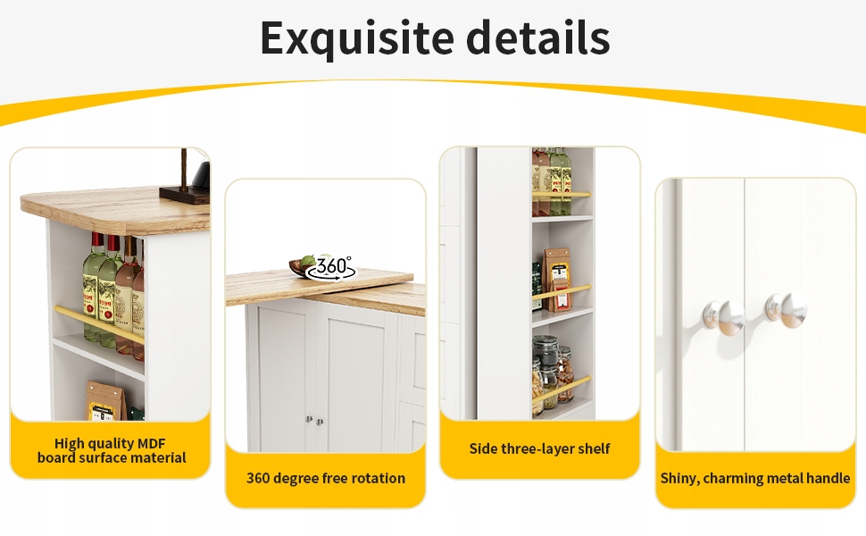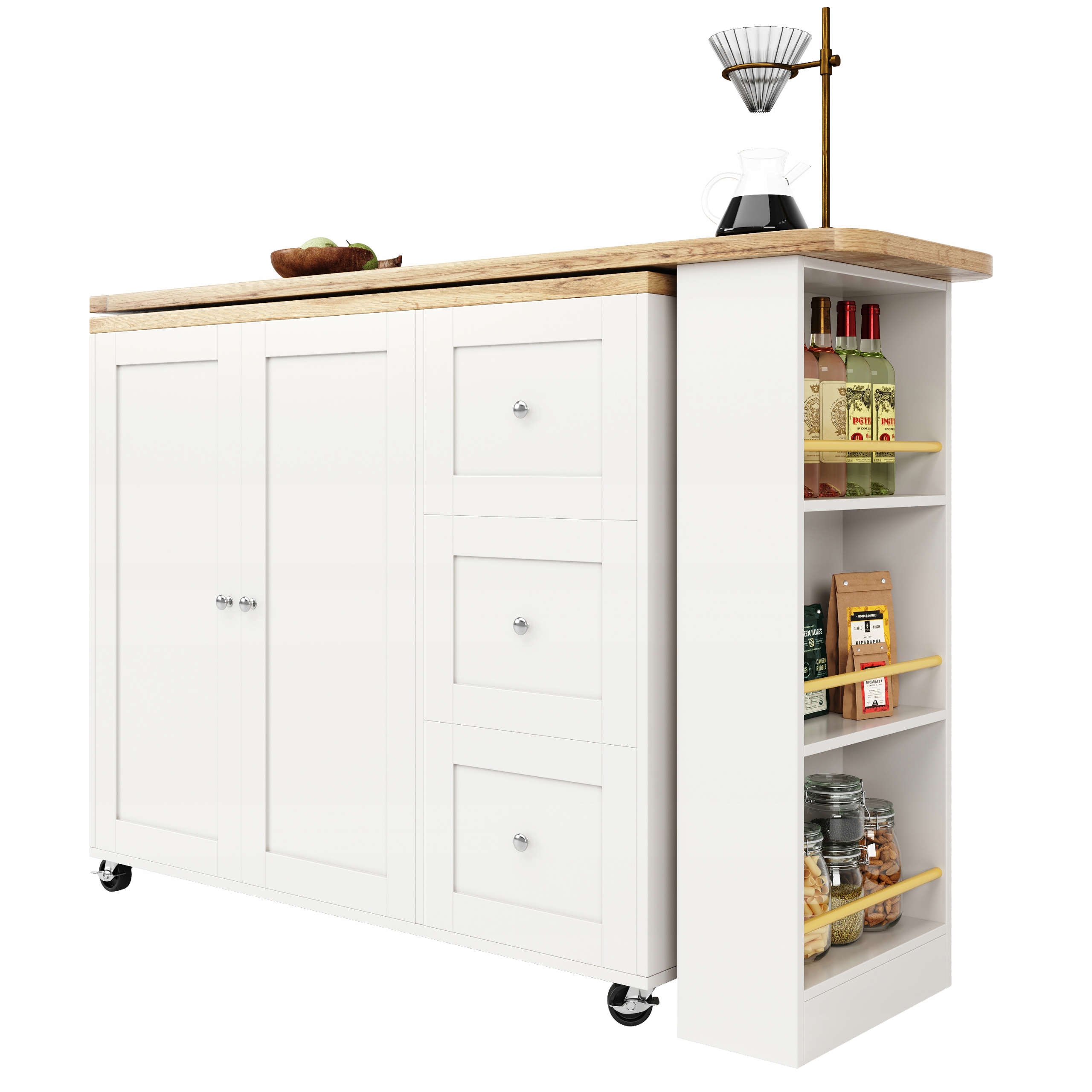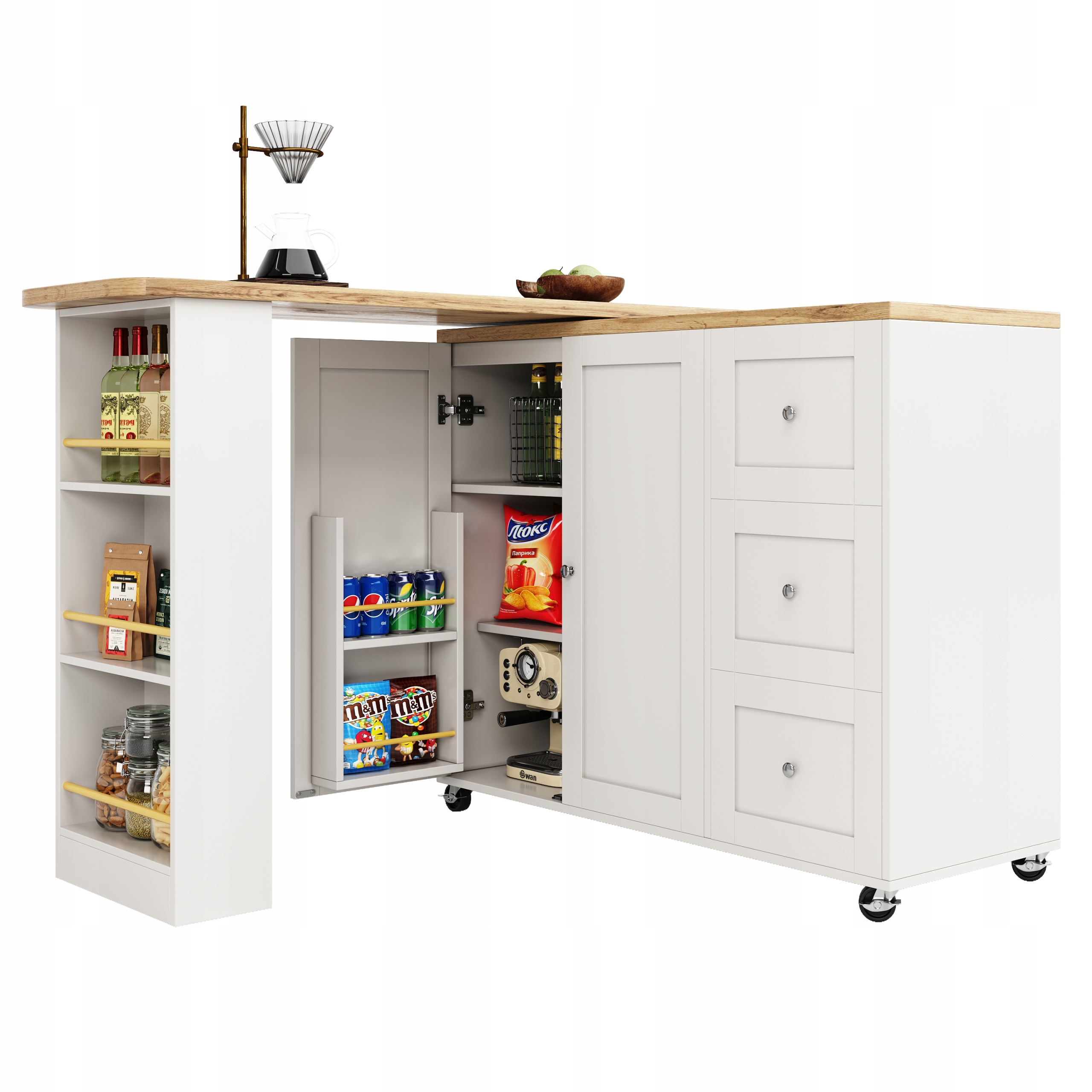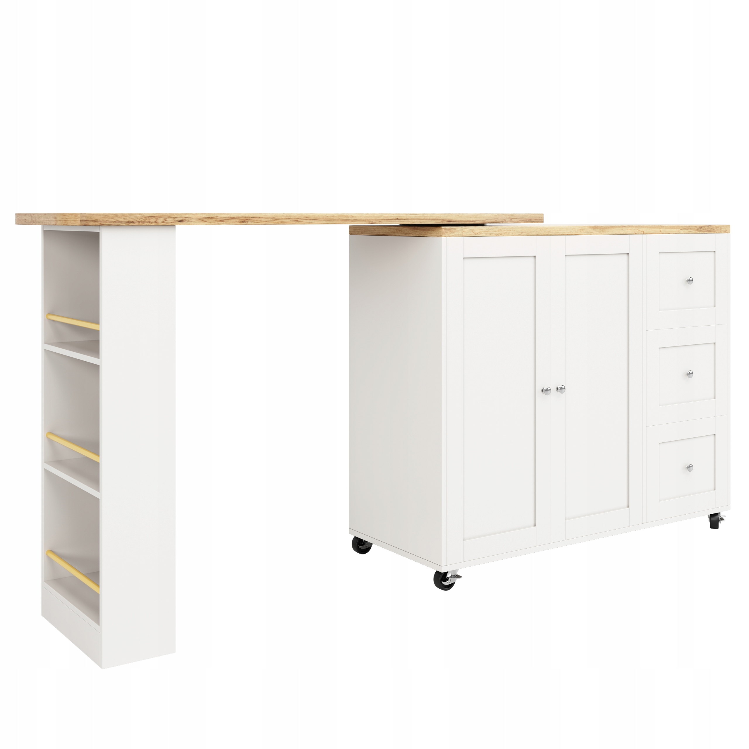 360 ° обертова смуга (138-209 x 39 x 106 см) на колесах, білі, з трьома ящиками. Включає закусочний. Багатофункціональний острів зберігання, що підходить для кухні та вітальні.