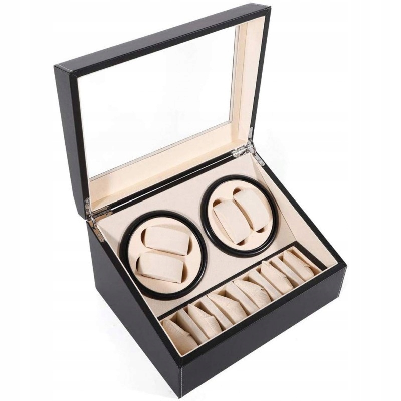 Елегантний ротомат для 4-х механічних годинників з автозаводом Просто увімкніть ротатор, щоб годинник обертався.Цикл обертання 2 хвилини в одну сторону, пауза - 6 хвилин і потім 2 хвилини в іншу сторону, пауза - 6 хвилин. Ці цикли повторюватимуться, доки ротомат не вимкнеться. Додатково має 6 слотів з подушечками для годинника Особливості продукту: - елегантна екошкіра, що імітує карбон - вбудований, майже безшумний електродвигун - внутрішня обшивка м'якою екошкірою - скло, що презентує годинник - елегантна кришка з еко. -шкіра імітація карбону - Блок живлення в комплекті Розміри: Ширина - 31,7 см Глибина - 23,5 см Висота - 17 см Упаковано по 2 шт.
