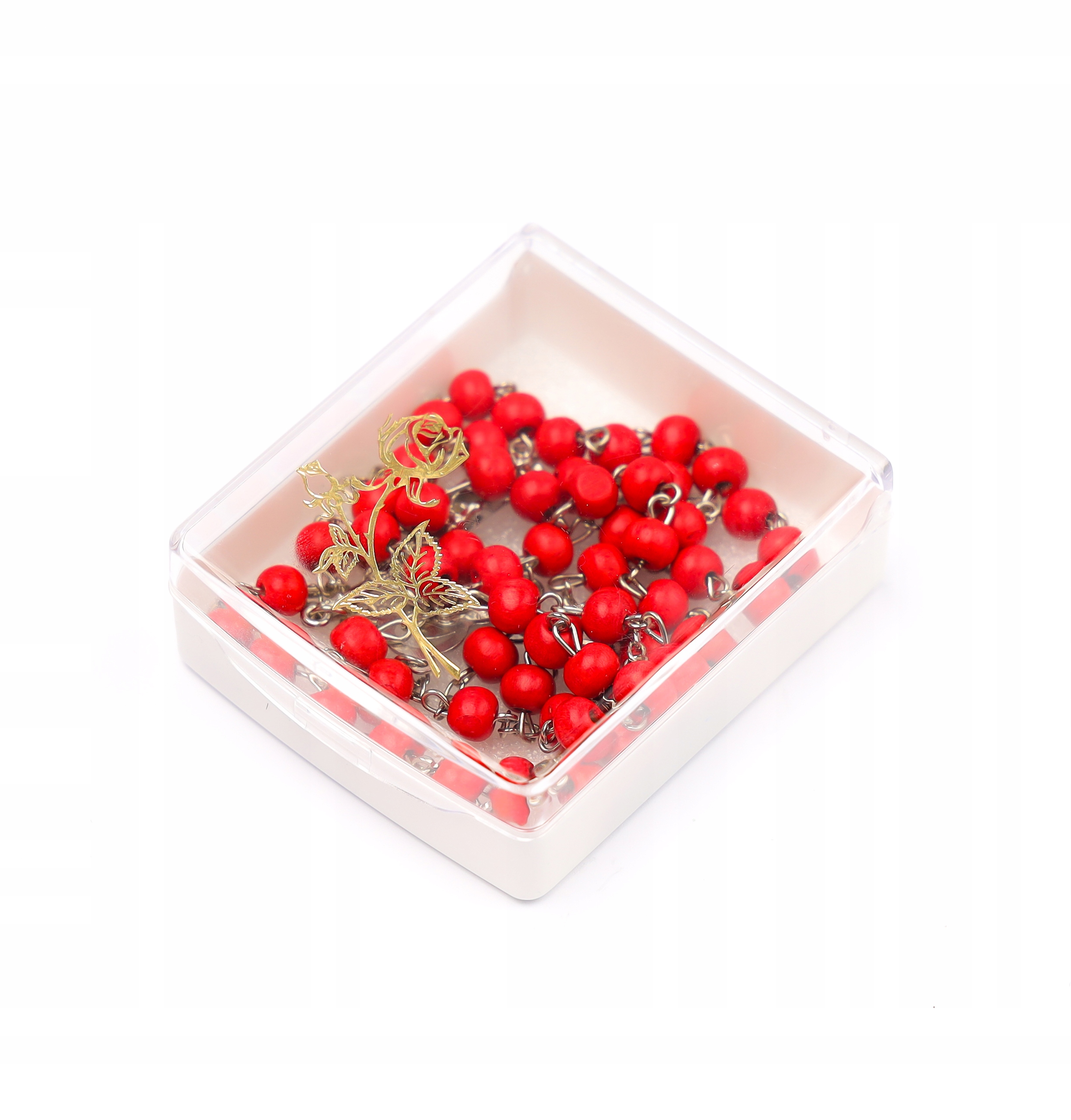 Розарій пахне пелюстками троянд. Бісер з дерева в тіні червоного кольору. Розарій закінчується хрестом (3,5 х 1,5 см). Зв'язки в розарію складаються з ланцюга. Ціле виготовляється естетично і упаковується в елегантну пластикову коробку. Розарій - ідеальна пропозиція, наприклад Для подарунка сувенір першого причастя, весілля, підтвердження.