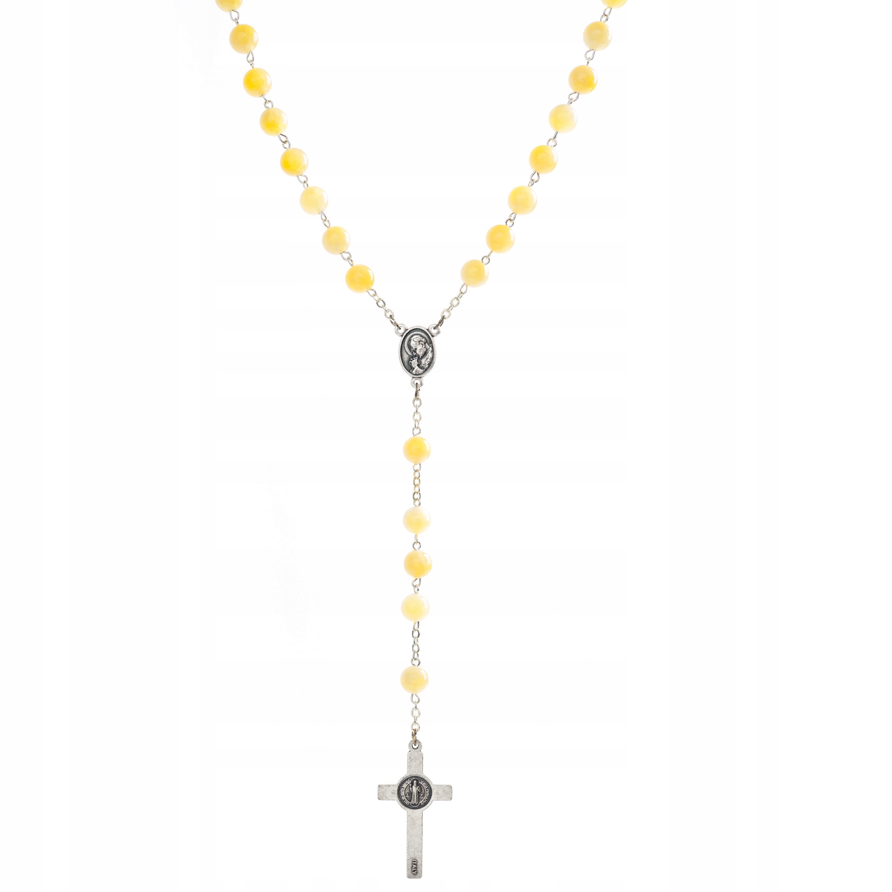 Цей розарій виготовлений з бурштинового нефритового каміння - з теплими відтінками золотистого, меду та вершків. Природна гра світла та різноманітність кольорів роблять кожен розарій єдиним у своєму роді.