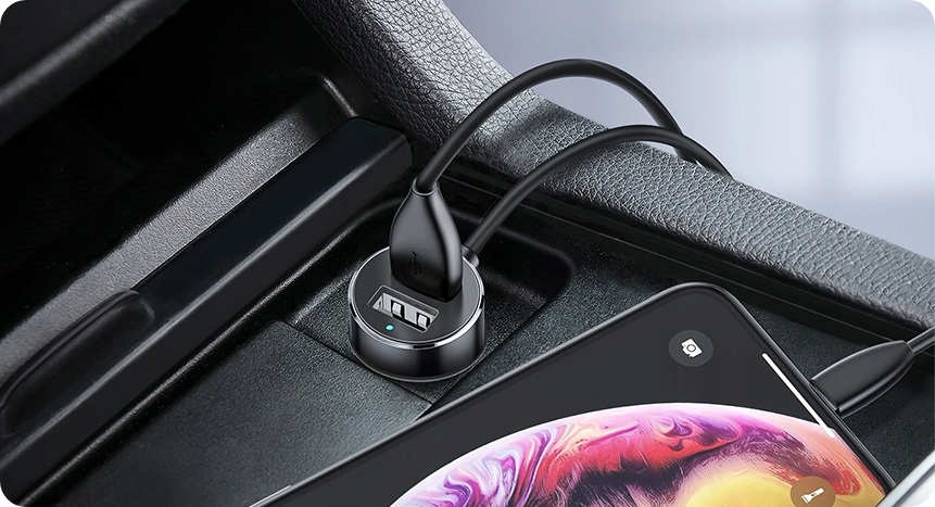 Автомобільний зарядний пристрій дозволяє заряджати кілька пристроїв одночасно завдяки двом портам USB і двом гніздам для прикурювача.