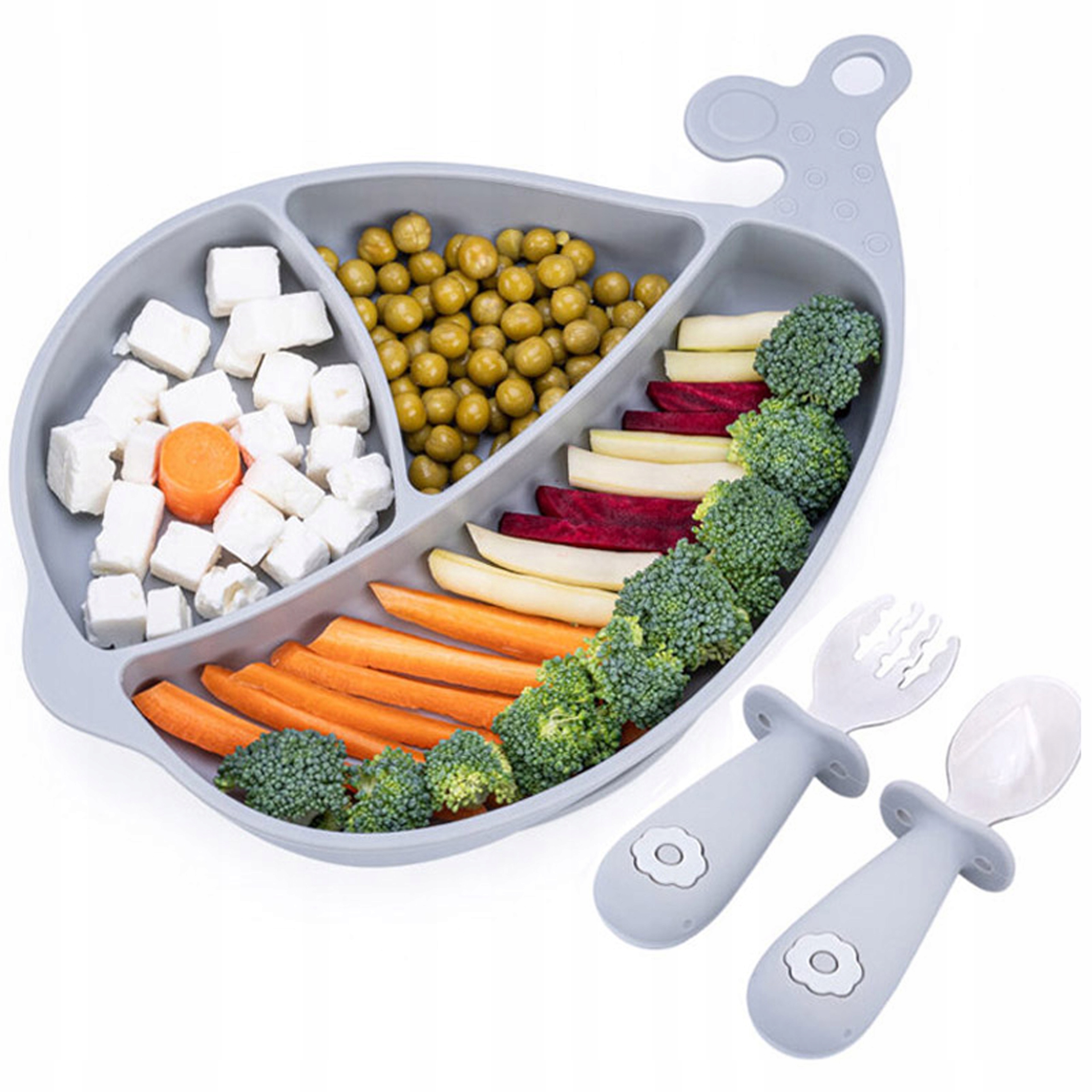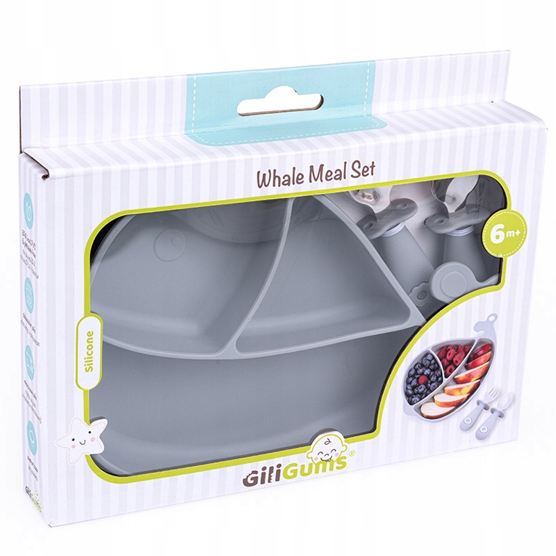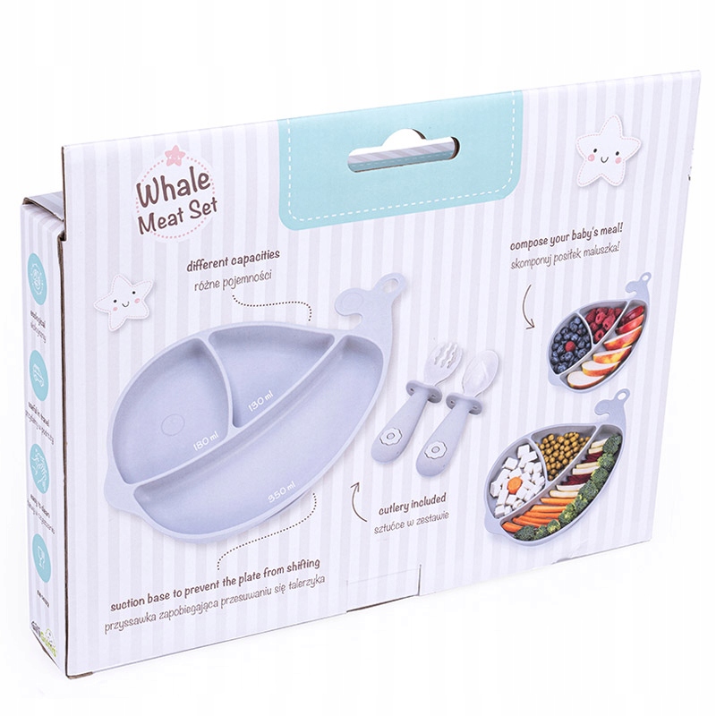 З цим набором прийом їжі перетвориться на смачну розвагу! У нього входить силіконова тарілка у формі кита і набір столових приборів (вилка і ложка) з нержавіючої сталі і силікону. Тарілка має три відділення, кожне з різною місткістю, що дозволяє правильно розташувати окремі елементи страви. В основі тарілки є силіконова присоска, яка запобігає зміщенню тарілки, полегшуючи самостійне їжа малюка. Столові прибори оснащені силіконовими ручками, які не дозволяють ложці або виделці безконтрольно вислизати з ручки. Набір також доступний у сірому кольорі.