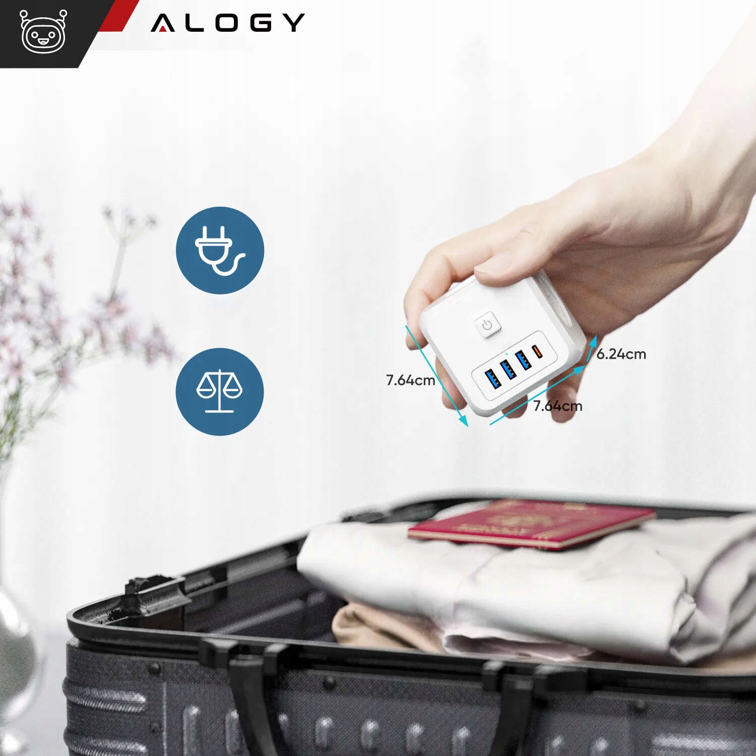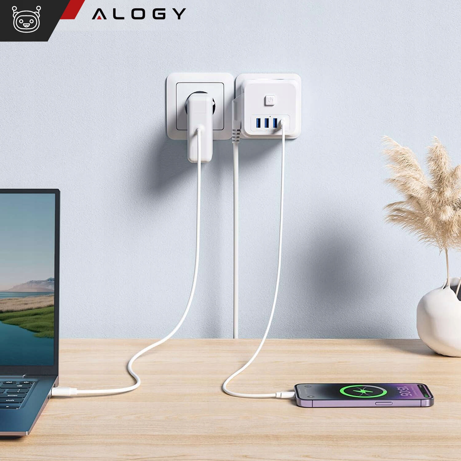 Сплітер розеток Alogy має три стандартні розетки PL/EU, три порти USB-A та один порт USB-C. Основні функції включають розподіл живлення на різні електричні пристрої та заряджання мобільних пристроїв без потреби в окремих зарядних пристроях.