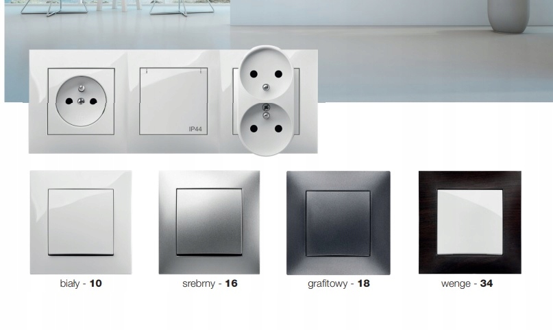 - модульні розетки та вимикачі вбудованого монтажу, що продаються в стандартній комплектації з єдиною рамою