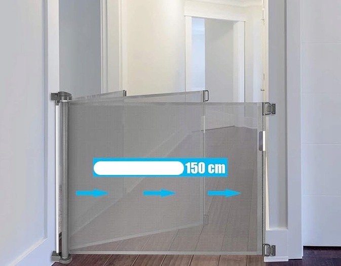 - [Розширена конструкція]: Ця захисна ворота для дітей для сходів може бути розширена до ширини 150 см і висотою 86 см. Він займає мало місця і розширено. Сітка може бути повністю згорнута, коли вона не використовується, без необхідності розібрати її. Він був розроблений, щоб відповідати двері до 150 см завширшки. Це зручно і економить місце.