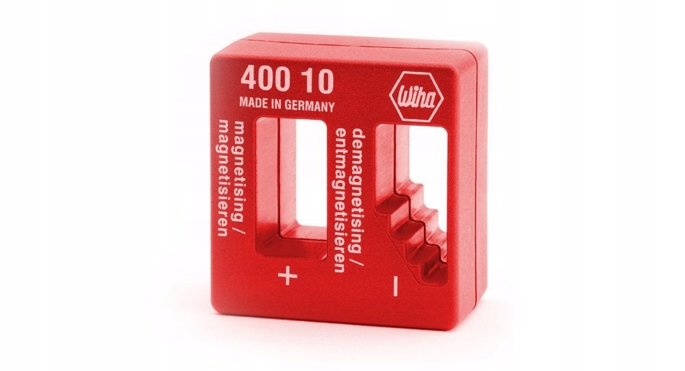 Під час закручування гвинт часто падає або губиться. Цю проблему усуває магнетизер Wiha. Швидко і легко намагнічує наконечник викрутки, полегшуючи прикріплення гвинтів і дрібних компонентів. Для розмагнічування викрутку переміщують у декілька прийомів, поки вона не розмагнітиться. Потужний постійний магніт інструменту надзвичайно міцний і ідеально підходить для намагнічування пінцетів та інших сталевих інструментів.