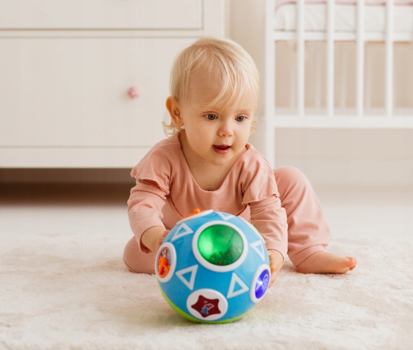 Покрутіться з обертовим м’ячем, який навчає, розважає та заохочує повзати! Іграшка розмовляє польською мовою, вчить називати цифри та фігури, а також грає веселі мелодії та блимає вогниками. Крім того, він кумедно крутиться, «тікаючи» від малюка і брязкаючи захованими в одній зі стінок намистинками. Перемикач режимів дозволить вам швидко перемикатися від навчання до гри та повністю вимикати звуки після гри.