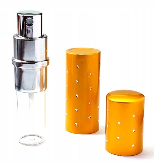 Атомайзер має алюмінієвий корпус золотого кольору, внутрішню скляну ємність і розпилювач.