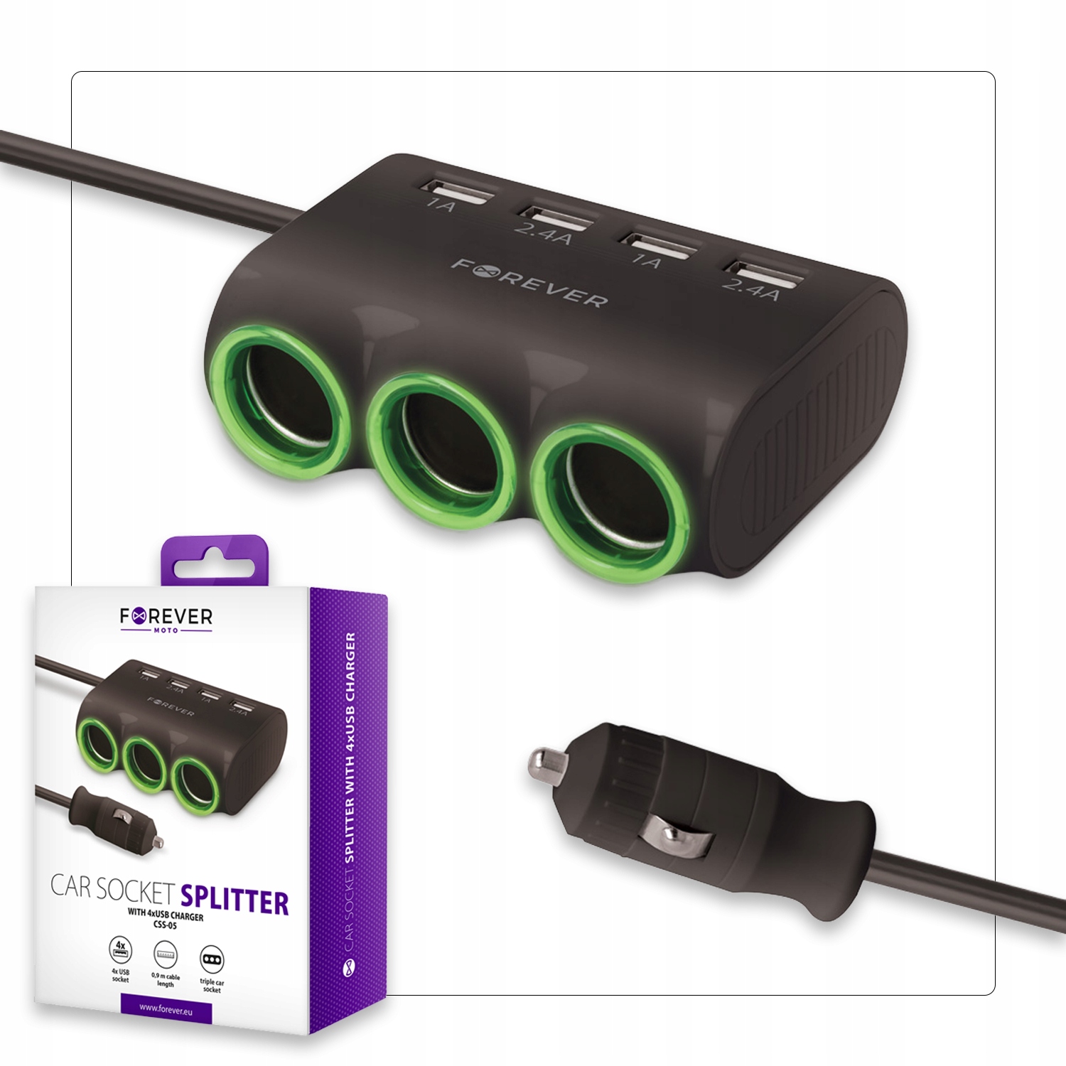 Розгалуджувач прикурювача від відомого бренду Forever оснащений аж чотирма USB-портами - двома з максимальним струмом 1А та два з максимальним струмом 2,4А.
