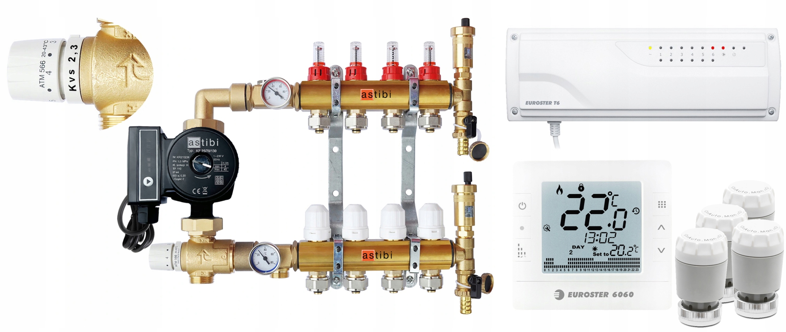 - Змішувальний набір для теплої підлоги з клапаном ATM566, енергозберігаючим електронним насосом ASTIBI 25-60/130