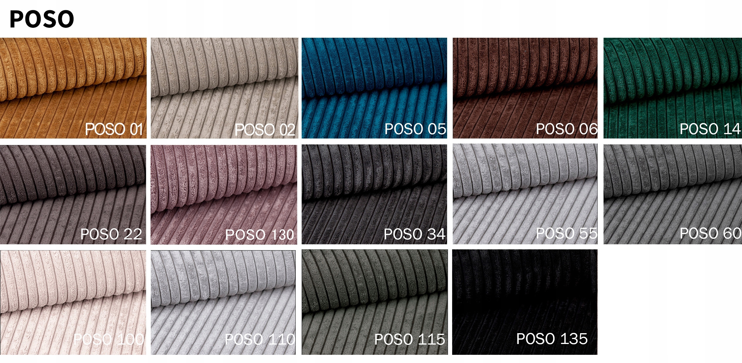 Посо – це м’ясистий товстий вельвет. Набір затишних кольорів. М'який, приємний на дотик. Загальні кольори з тканиною Kronos - широкі можливості комбінування