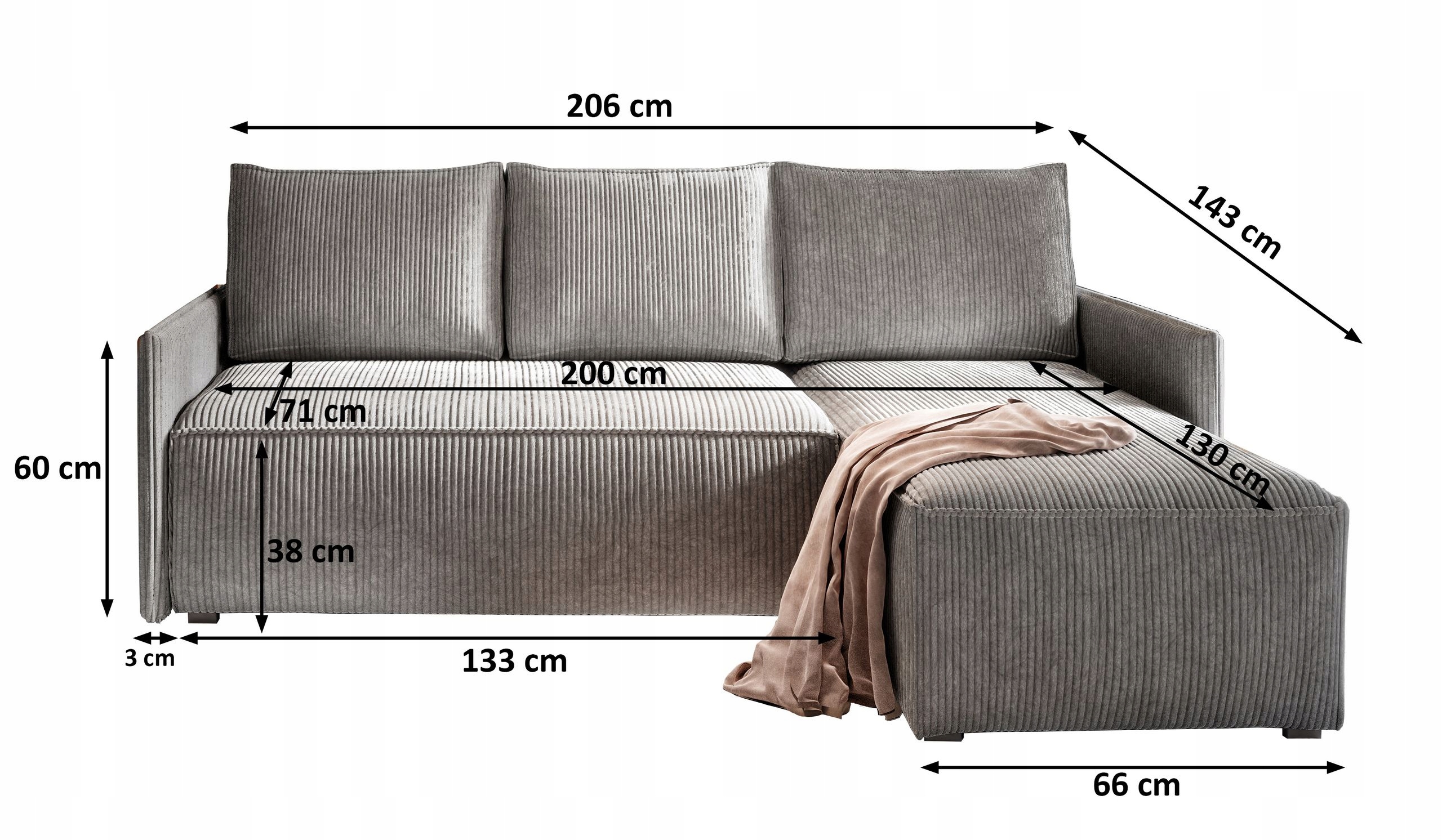 Шукаєте непідвладні часу меблі для стильного інтер'єру? Кутовий диван PERUSI - ідеальний вибір для вас. Виготовлена з ребристої тканини, що нагадує вельвет, вона приваблює погляди та забезпечує неймовірне відчуття розкоші, будучи справжньою візуальною привабливістю.