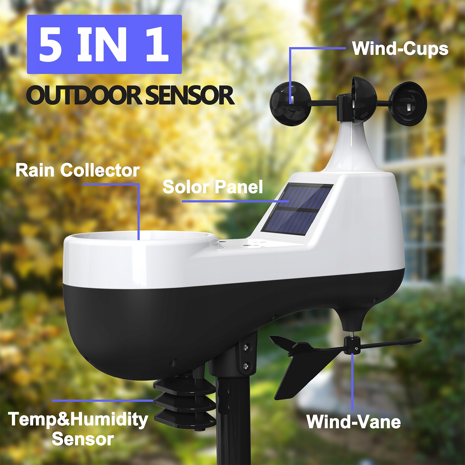 4. Зовнішній датчик 5-в-1: цей компактний зовнішній датчик метеостанції включає в себе вітер, анемометр, дощомір, датчик температури та вологості та сонячну панель.
