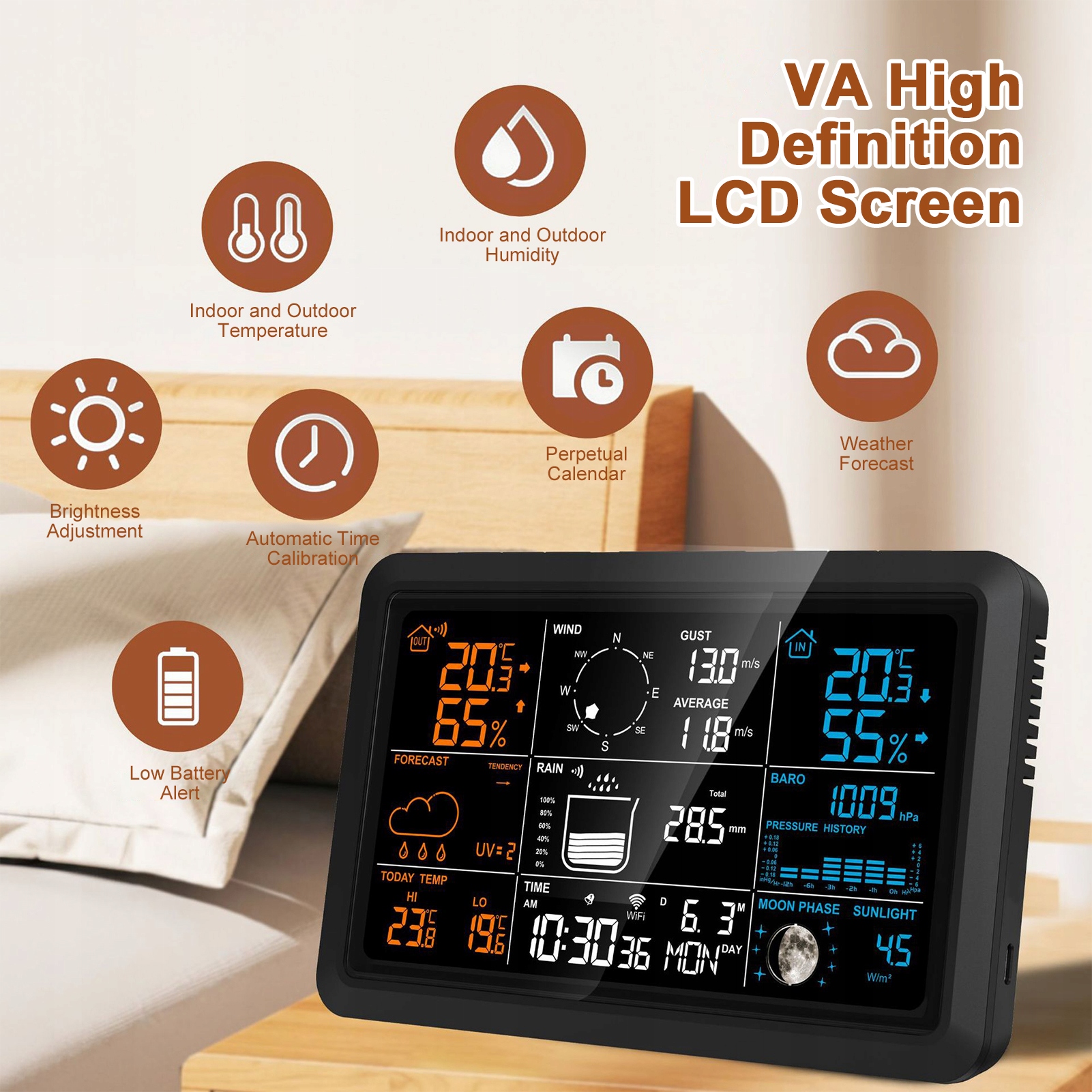 3. 7,5-дюймовий кольоровий екран: дисплей метеостанції має 7,5-дюймовий РК-екран із чітким і чітким дисплеєм. Області інформації розділені для кращої організації, що полегшує перегляд даних з різних точок зору.