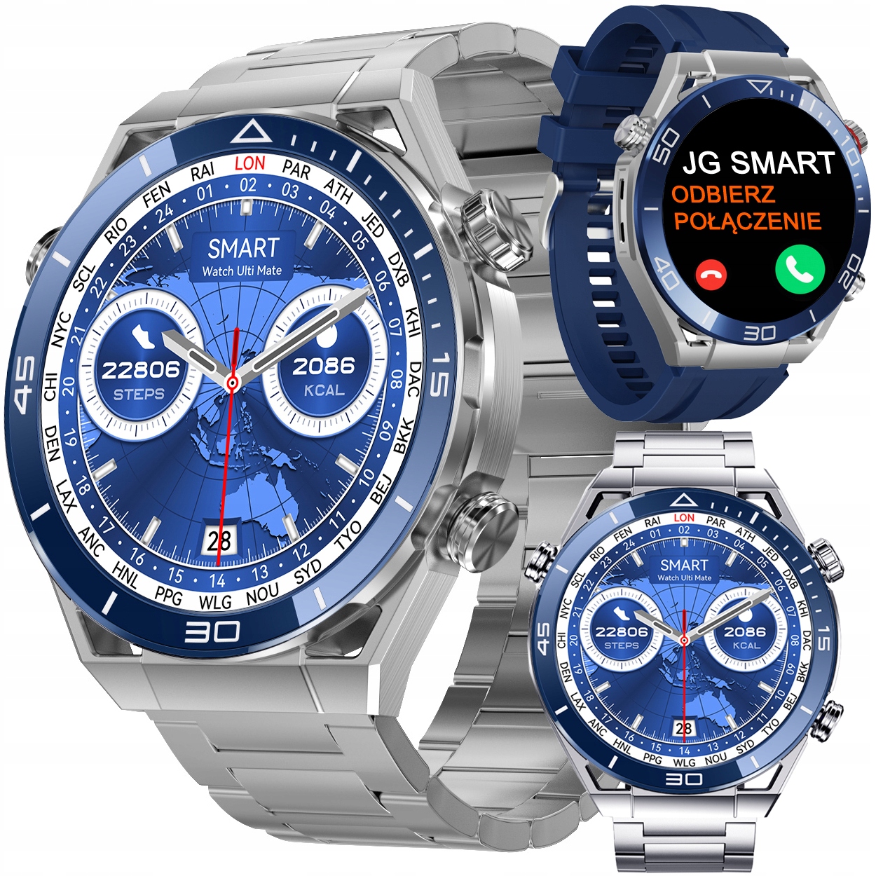 JG SMART ULTIMATE має три ремінця: силіконовий, шкіряний та з нержавіючої сталі. Крім того, він має гучномовець і мікрофон, що дозволяє здійснювати дзвінки безпосередньо через годинник.
