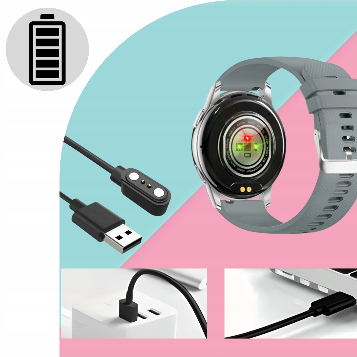 - Щоб підключити наш смарт-годинник для зарядки, скористайтесякабелем USBв комплекті, який можна підключити до комп’ютера, ноутбука та зарядного пристрою (не входить в комплект - можна придбати на нашому іншому сайті) аукціон). До сумісних зарядних пристроїв належать, наприклад, зарядні пристрої для мобільного телефону чи планшета. Максимальна інтенсивність заряду - 1А, не використовуйте "швидкі" зарядні пристрої. Розумний годинник можна заряджати через USB-порт комп’ютера, але це займе більше часу, ніж використання традиційного зарядного пристрою.