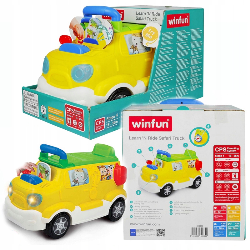 • Має висувну ручку• рухливі елементи• рацію та компас• Відсік для зберігання аксесуарів• Картки із зображеннями 26 тварин і літер• 2 режими гри: режим навчання та вікторини• Світяться фари