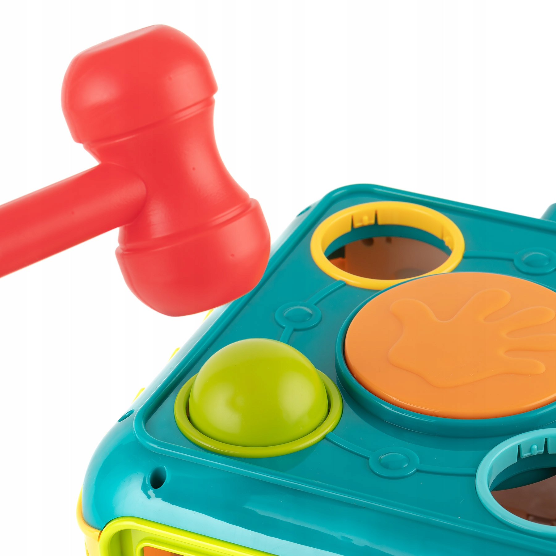- Барабан і аркадна гра з молотком. Вдаряйте по кульках молотком і заганяйте їх усередину сортувальника - шукайте дверцята, щоб вийняти кульки, і починайте знову (3 кольорові кульки та молоток входять у комплект)