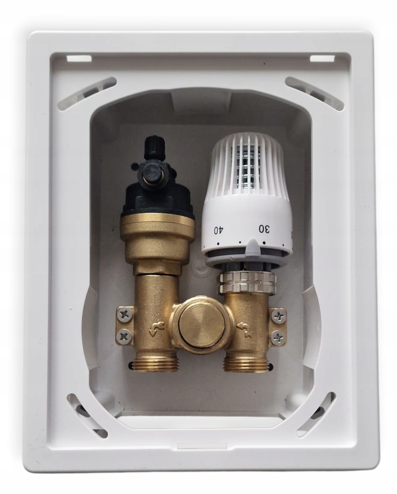 Касетний клапан з обмеженням температури для теплої підлоги. Встановлюється в системі повернення в естетичній коробці з пластиковою передньою стороною як в стіні, так і в рамах і гіпсокартонних плитах.
