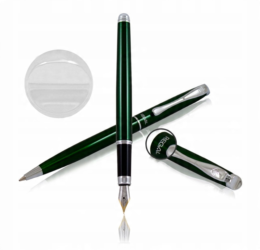 Елегантний набір REGAL "Edward green" зеленого кольору, що містить ручку зі срібним і золотим пером (1,8 x 0,8 см), прикрашену гравіюванням Фірмова емблема Regal. Кулькова ручка з висувним стержнем.