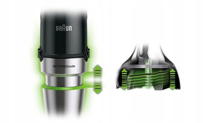 - Технологія ACTIVEBlade забезпечує рух лез вгору та вниз, що дозволяє швидко змішувати всі інгредієнти, навіть найтвердіші. Рухоме лезо використовує ще більшу активну зону змішування, що гарантує очікувану однорідність щоразу. Цей розчин запобігає утворенню т.зв сліпа зона, тобто вільний простір над і під ніжкою, де інгредієнти лише обертаються, а не потрапляють під ножі.