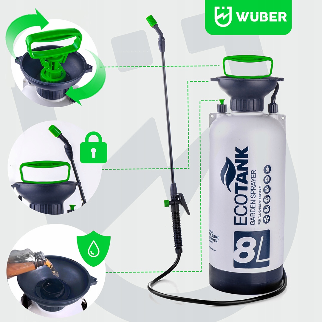 - Ємність 8 літрів - дозволяє легко обприскувати велику кількість рослин на великих площах.