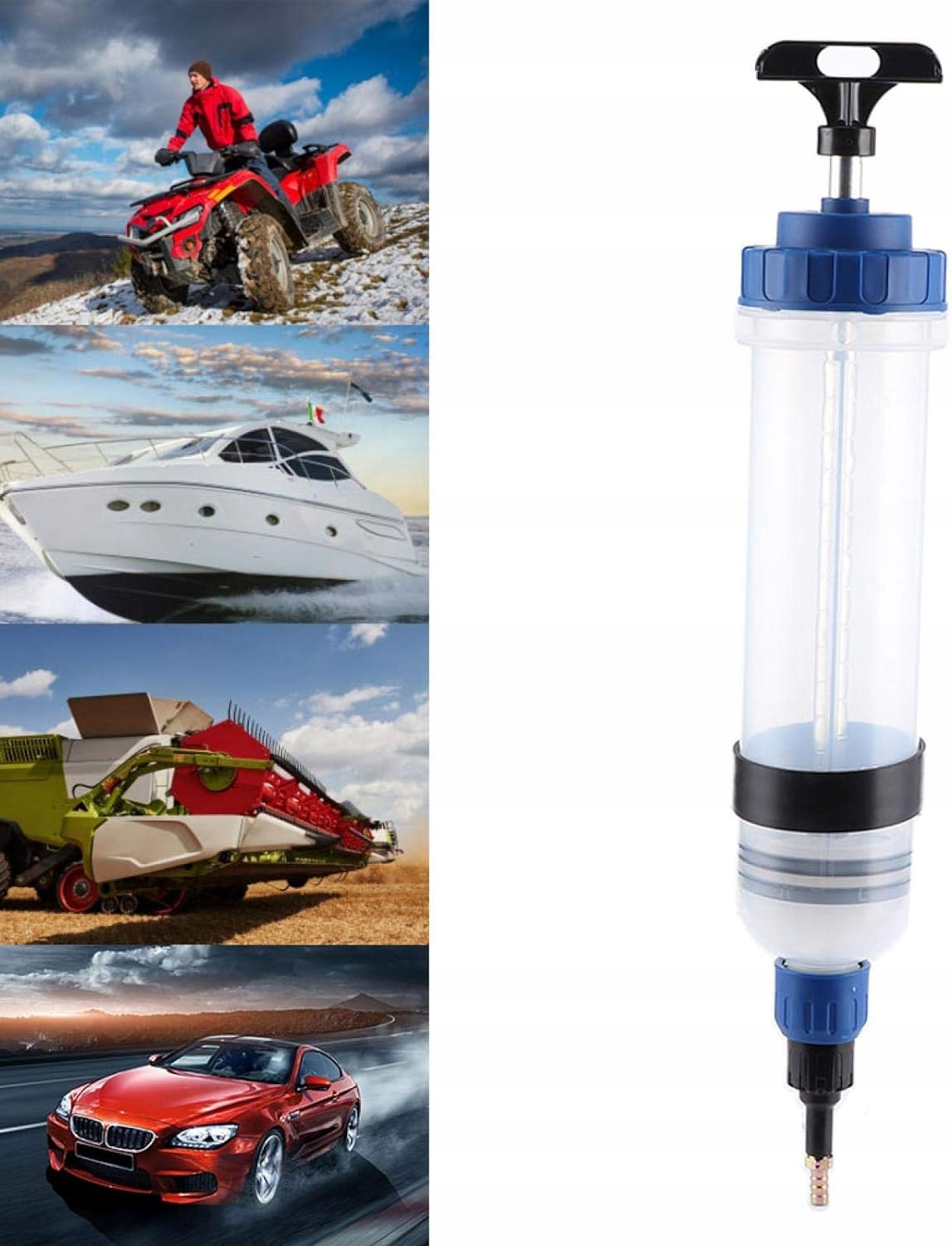 Цей наповнений рідиною шприц забезпечує простий вибір. Його можна використовувати для видалення та доливання гальмівної рідини, антифризу, трансмісійної рідини, рідини для гідропідсилювача керма тощо. Використовуйте для очищення або заміни позашляховиків, човнів, сільськогосподарського обладнання, промислових трансмісій, мотоциклів, фургонів тощо. Ідеально підходить для моторні масла або мастильні матеріали в автомобілях.