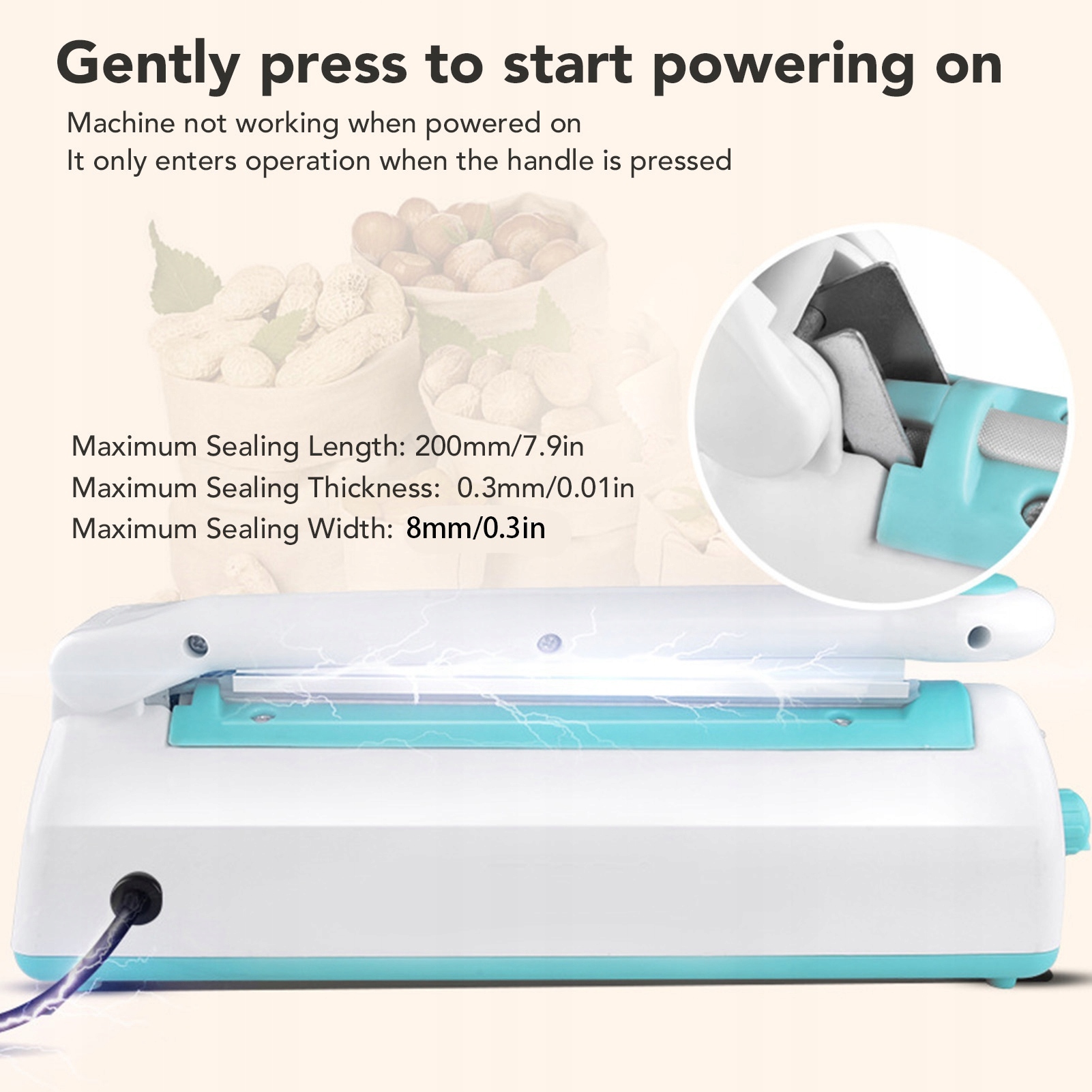 3. ШИРОКЕ ЗАСТОСУВАННЯ: ручний запаювач підтримує максимальну довжину зварювання 200 мм і ширину 8 мм, підходить для мішків різних розмірів.