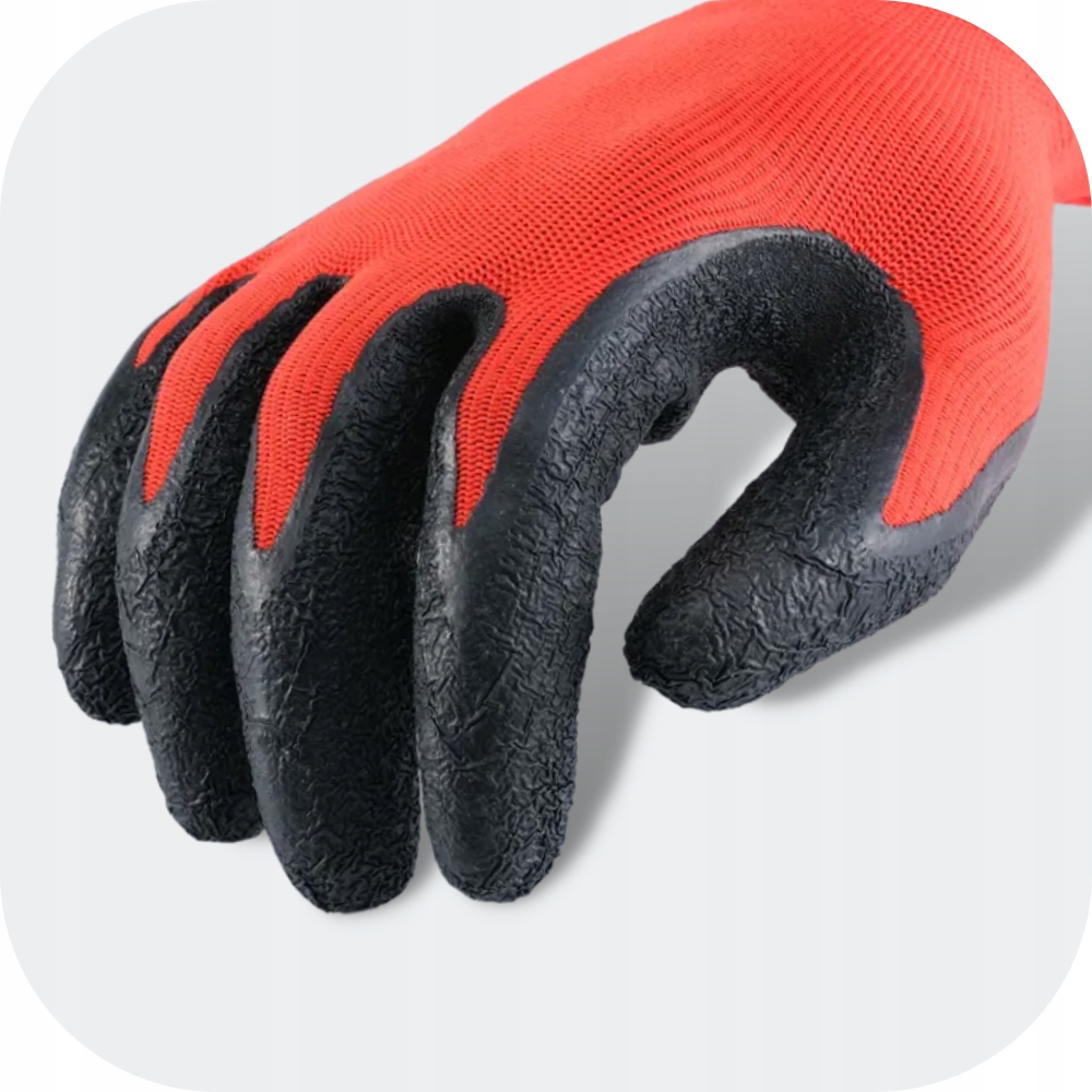 Робочі рукавички з латексним покриттям мають грубе покриття. Це спеціальне покриття на поверхні рукавичок забезпечує гарне зчеплення, що підвищує контроль над інструментами та матеріалами, а отже зводить до мінімуму ризик ковзання або падіння предмета. Крім того, дякуємо до грубого покриття, рукавички забезпечують хороший захист від стирання та механічних пошкоджень. Якщо користувач працює у вологих умовах, шорстке покриття дозволяє міцно тримати інструменти та контролювати їх, b> забезпечення ефективного захисту від ковзання.
