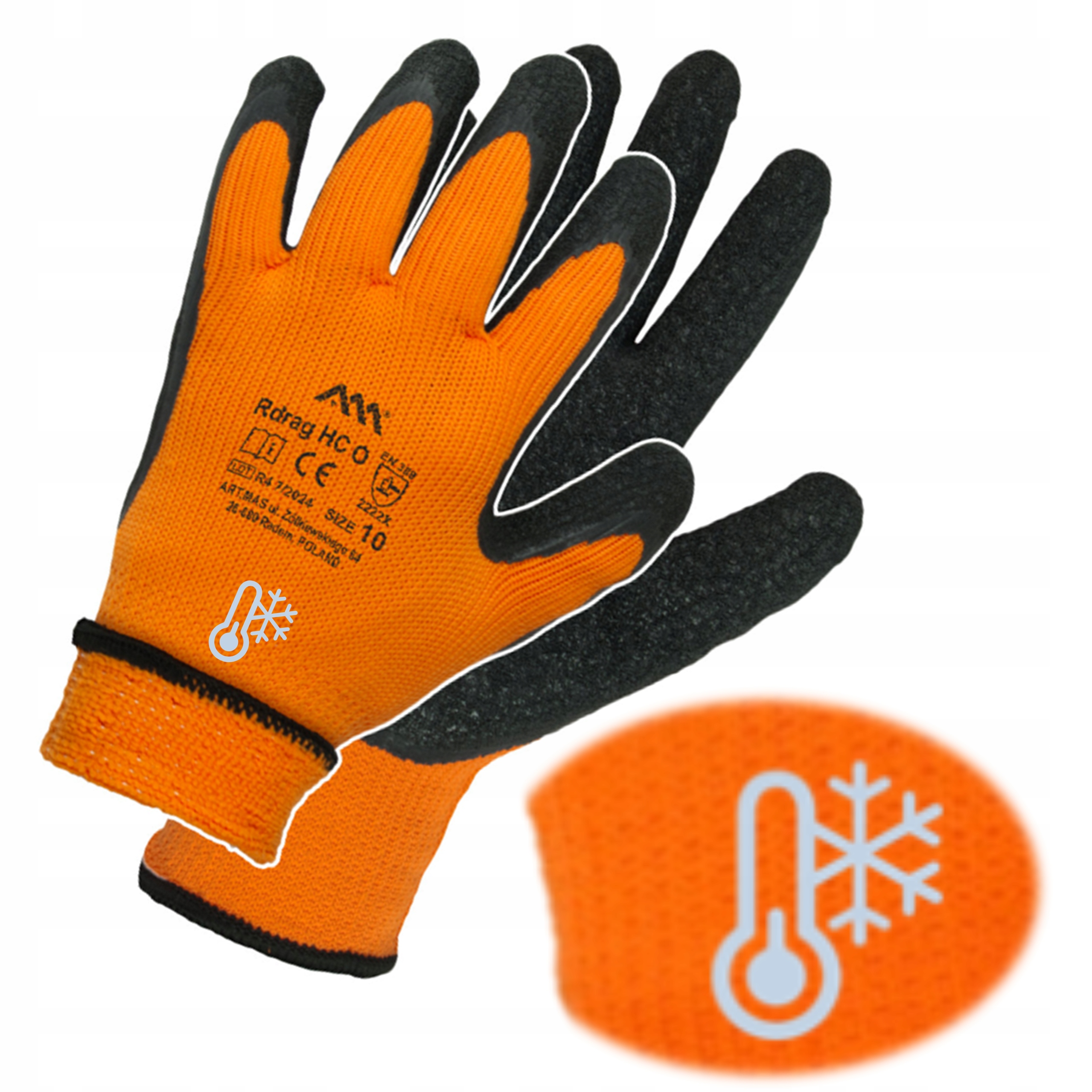 Рукавички захисні утеплені трикотажні безшовні флуоресцентного оранжевого кольору з акрилової махрової тканини (всередині махрова). Покритий шорстким чорним латексом, оброблений рантом. Ідеально підходить для використання в зимових умовах.