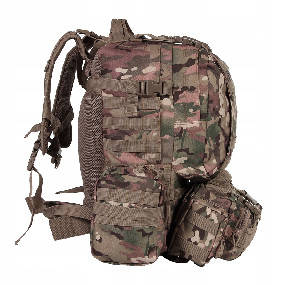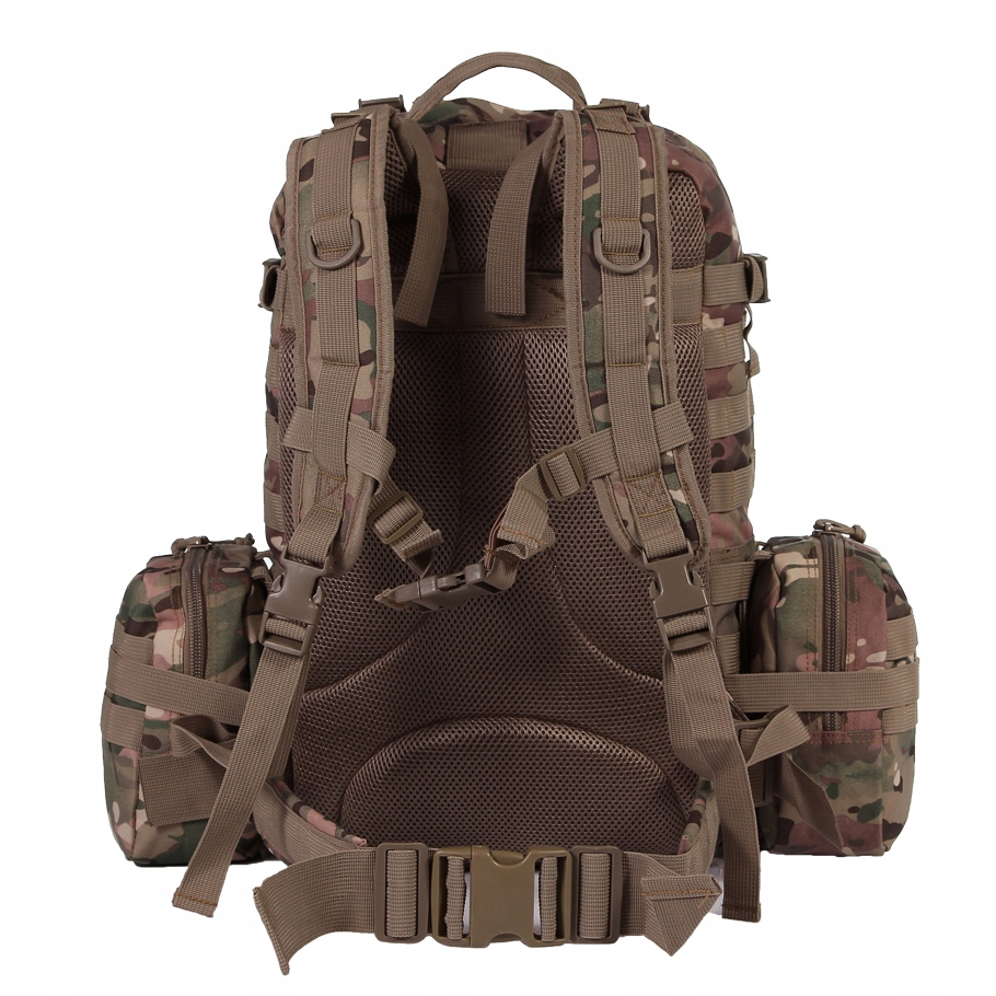 Знайде широке застосування в туризмі. Міцний, місткий, практичний і зручний. Оснащений великою багатофункціональною сумкою і двома знімними лотками. Модульні панелі дозволяють розширити рюкзак додатковими кишенями та лотками та налаштувати їх розташування відповідно до ваших потреб. Модульні панелі в системі MOLLE / PALS, дві спереду і дві з боків рюкзака. Лотки і сумка оснащені модульними стрічками. компресійні лямки зменшують розмір рюкзака і не дають вантажу зрушуватися. Верхні D-кільця для кріплення ручних речей і шви внизу рюкзака дозволяють прикріпити спальник або спальний мішок. Він виготовлений із міцного поліестеру 1000D, який характеризується підвищеною стійкістю до стирання та зношування..