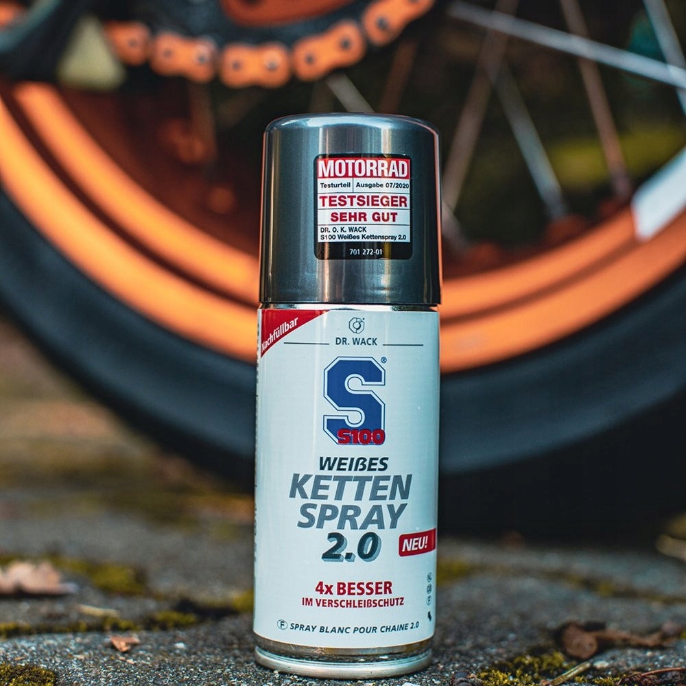 для всіх типів ланцюгів приводу. Підготовка S100 Weisseketten Spray 2.0. Нанесіть на внутрішню сторону чистого і сухого ланцюга. Залиште висохнути близько півгодини або всю ніч.